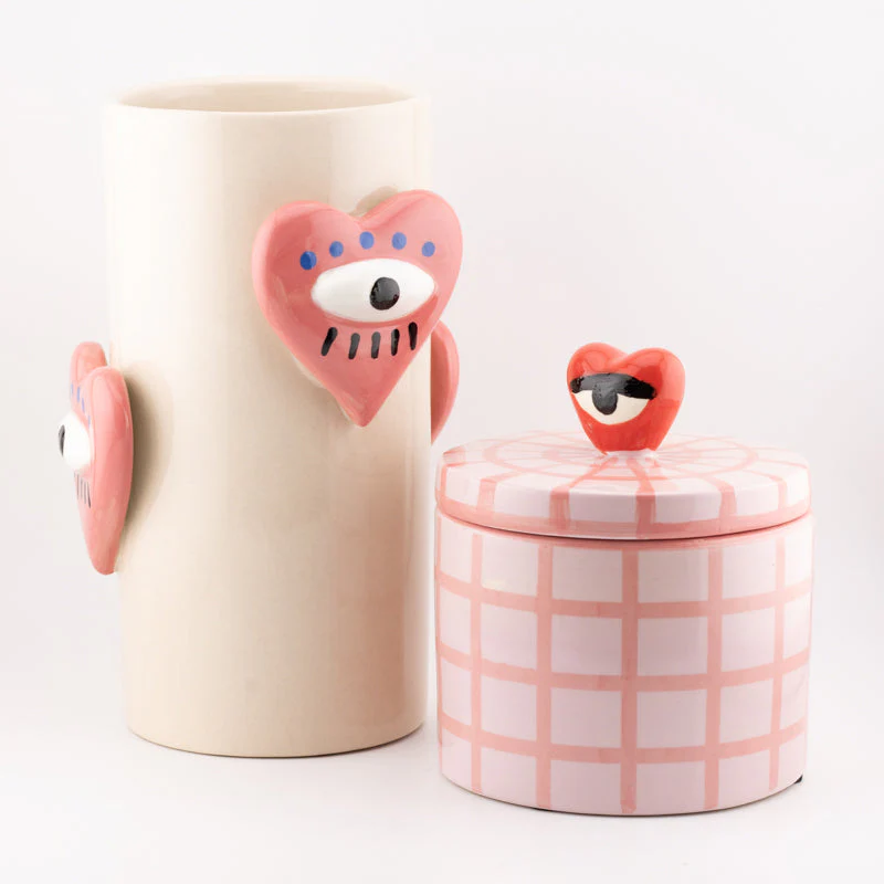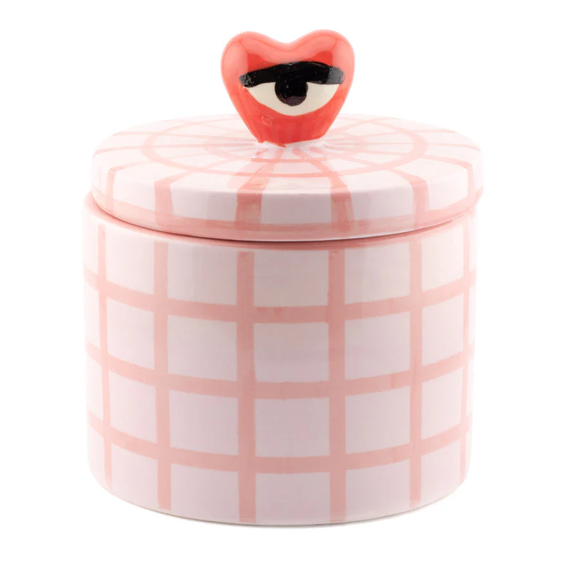 Het opbergbakje dat precies ziet wie de koekjes of snoepjes eruit haalt. In prachtig oud roze met als knop het alziend oog. Past perfect bij een van onze rood/roze vazen en natuurlijk de All Seeing Eye vaas. 13 cm hoog en 11,5 cm doorsnee.