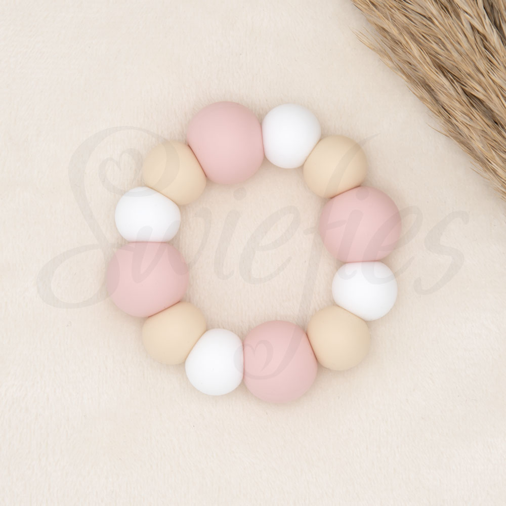 Een Swiefies bijtring is een uniek, stijlvol en veilig product dat de pijn bij doorkomende tandjes verzacht. De bijtring wordt in Nederland met de hand gemaakt van een stevig satijndraad en siliconen kralen.