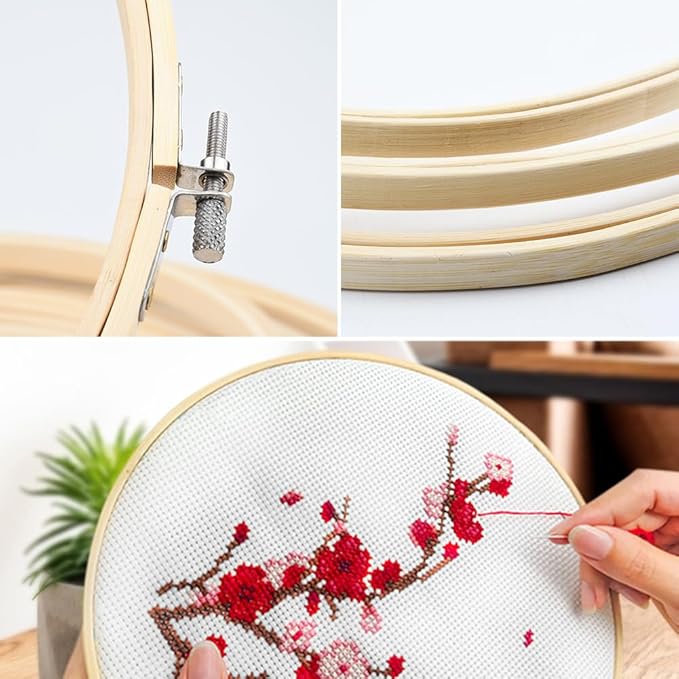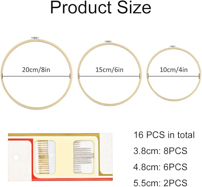 Deze complete set van 3 bamboe borduurringen is perfect voor elke borduurliefhebber, of je nu een beginner bent of al ervaring hebt. De ringen zijn verkrijgbaar in drie verschillende maten: 10 cm (4 inch), 15 cm (6 inch) en 20 cm (8 inch). Gemaakt van veilig en geurloos bamboe, bieden ze een stevige maar lichte basis voor al je borduurprojecten. Het natuurlijke materiaal kan soms lichte oneffenheden vertonen, maar dat hoort bij de charme van bamboe.