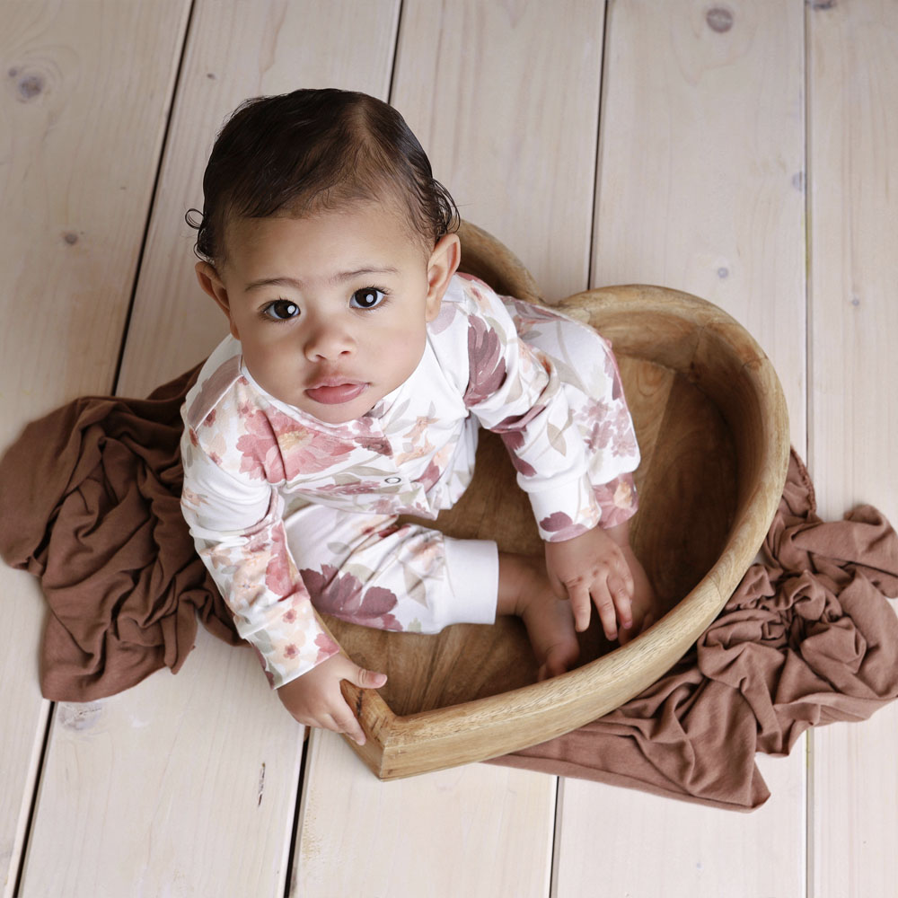 Het boxpakje Vintage Floral is een Off-White (gebroken wit) boxpakje bedrukt met mooie bloemen. Verkrijgbaar in maat 50 t/m 68 en te combineren met het haarbandje en/of mutsje Vintage Floral.