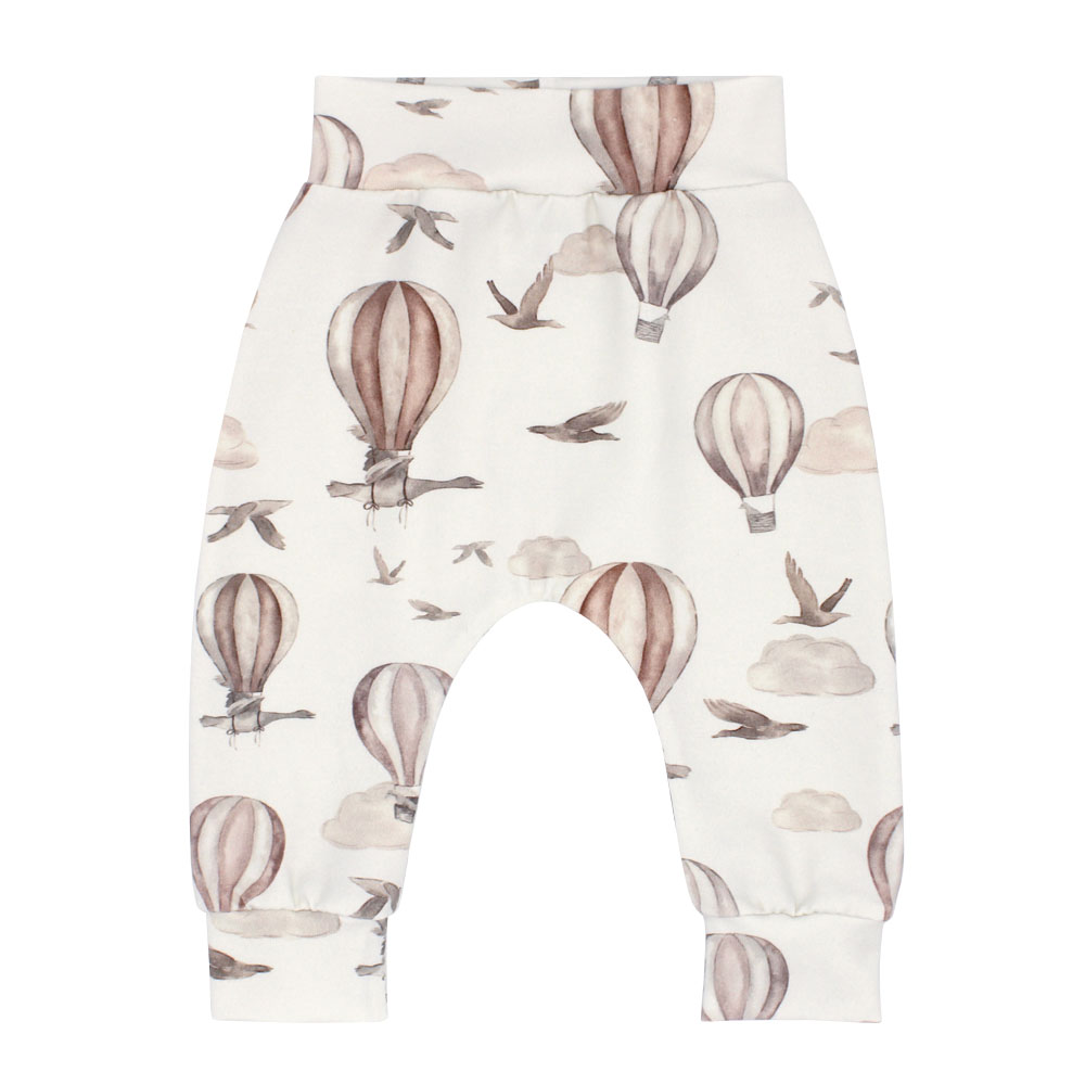 Het broekje Air Balloons is een Off-White (gebroken wit) baggy broekje bedrukt met luchtballonnen. Verkrijgbaar in de maat 50 t/m 80 en te combineren met het shirtje Sand of Taupe en het haarbandje en/of mutsje Air Balloons.