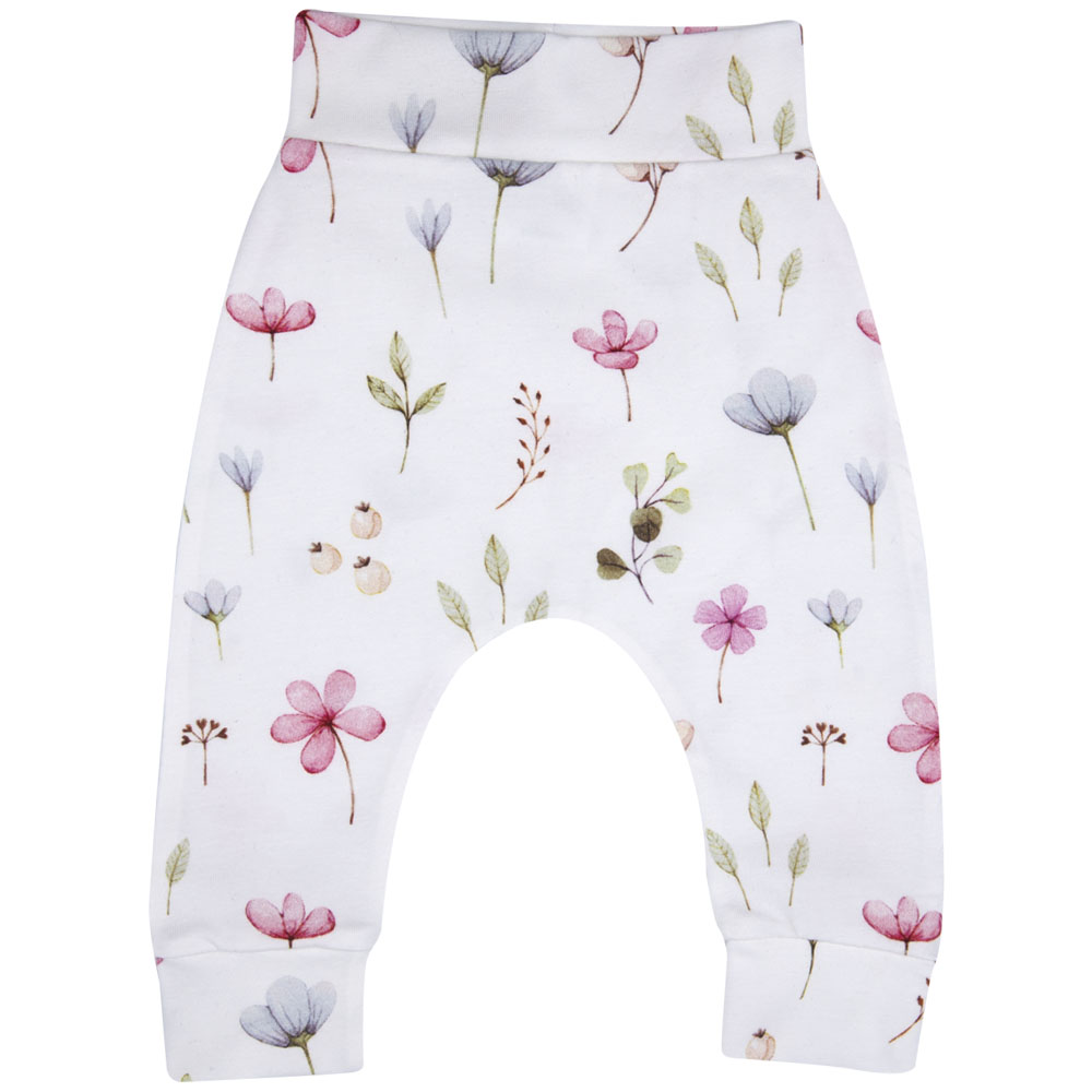 Het broekje Field Flowers is een Off-White (gebroken wit) baggy broekje bedrukt met mooie veldbloemen. Verkrijgbaar in maat 50 t/m 80 en te combineren met het haarbandje en/of mutsje Field Flowers.