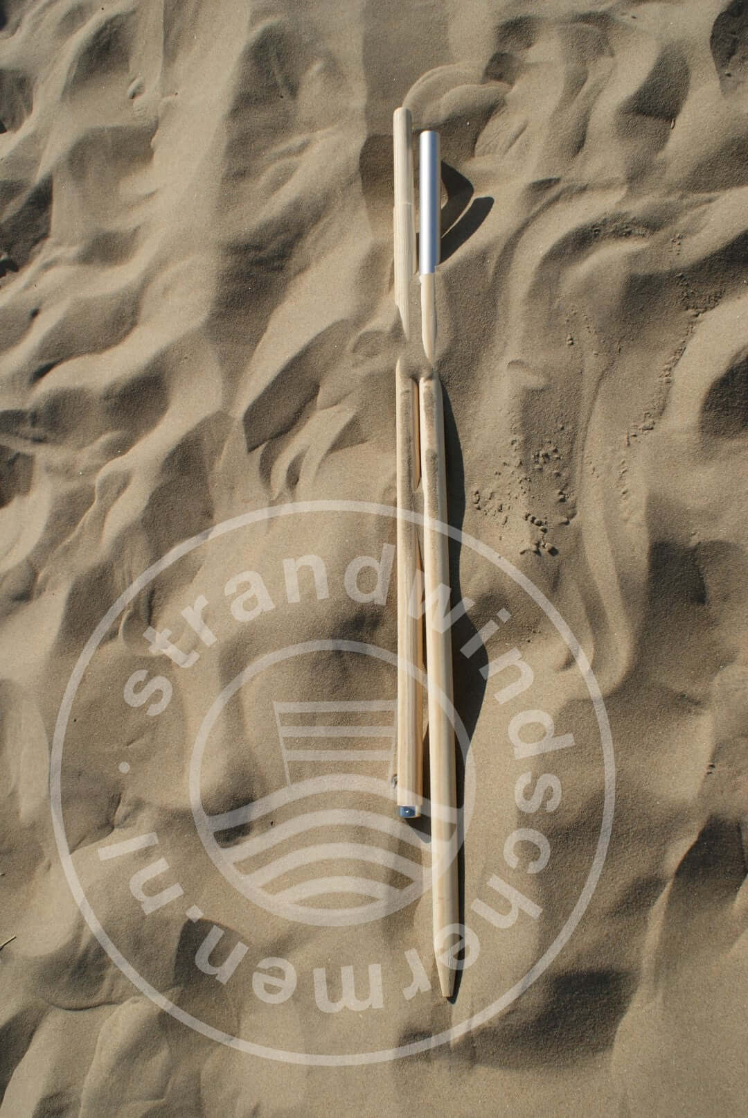 De Houten Stokken (1-Delig en Deelbaar) zijn ideaal voor op het Strand, de Stokken eindigen in een Punt, waardoor ze zich zeer gemakkelijk, met een Houten Hamer, 25-30cm. het zand in laten slaan. Scheerlijnen en Haringen NIET nodig! De Aluminium Stokken hebben geen Punt, daardoor dus niet geschikt voor op het Strand!
