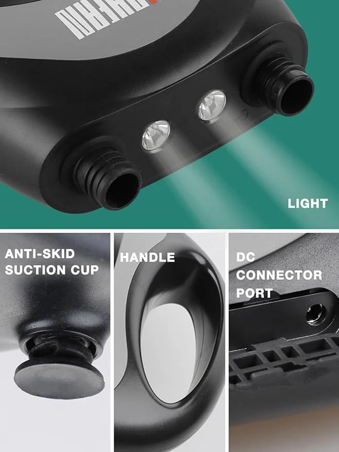✔️ Slimme functies: Eenvoudige bediening met 5 knoppen voor aan/uit, modusselectie en drukinstellingen. Het LED-display houdt je op de hoogte van de voortgang, terwijl de automatische stopfunctie overinflatie voorkomt. Met ingebouwde LED-verlichting ben je altijd goed zichtbaar, zelfs bij weinig licht.