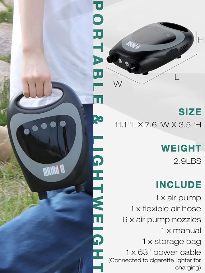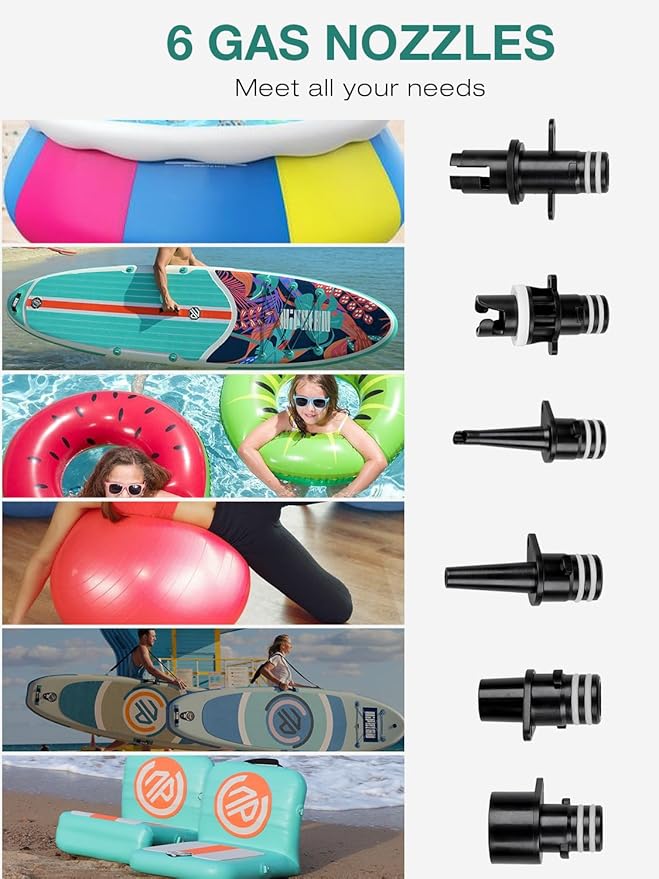 ✔️ Veelzijdige opblaaskits: Inclusief zes mondstukaccessoires, perfect voor paddleboards, luchtbedden, kajaks, boten en meer. Geniet van één handige oplossing voor al je opblaasbehoeften, ideaal voor stranddagen en kampeertochten.