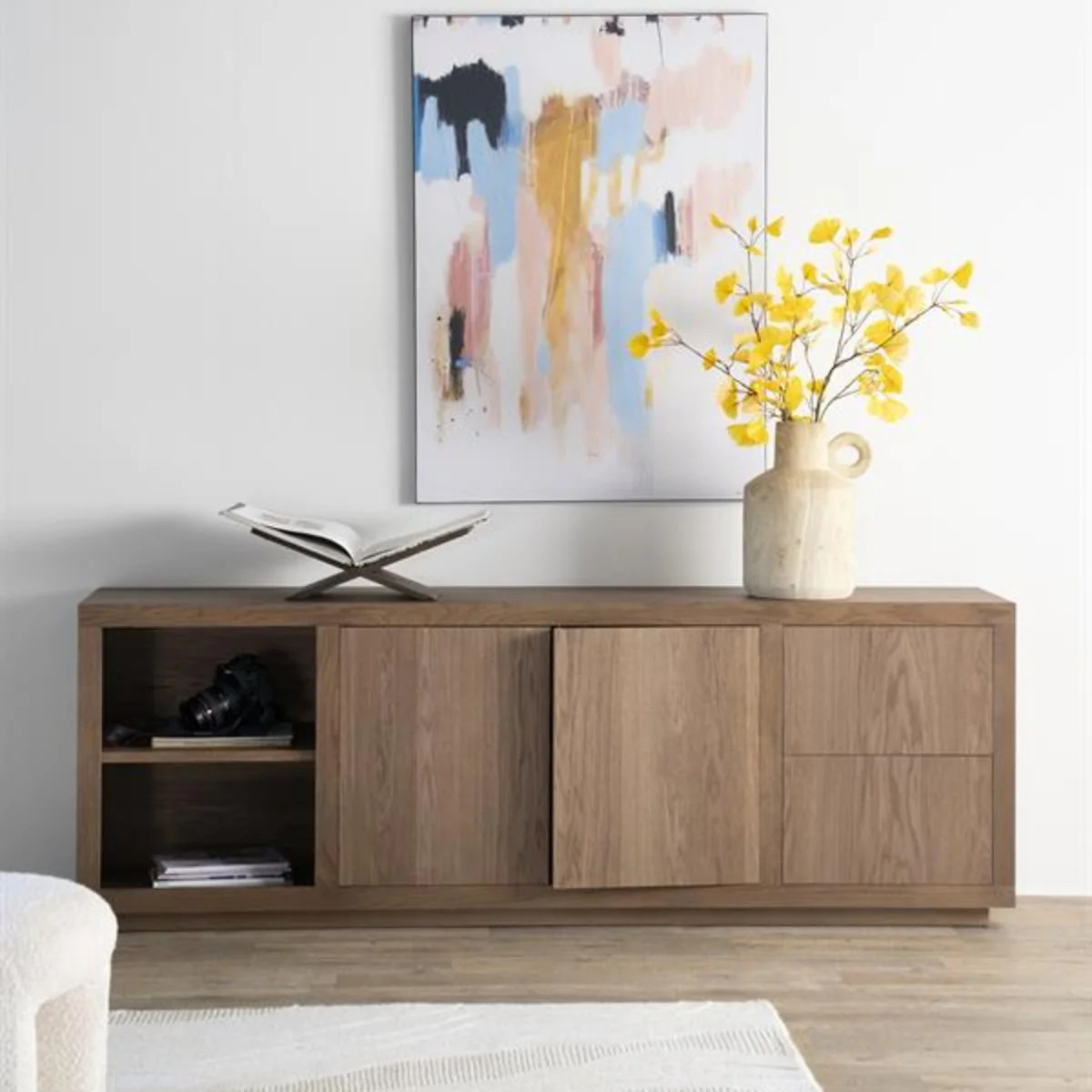 Het dressoir Helsinki is een opbergmeubel uitgevoerd in eikenhout en eiken fineer. De lichtbruine kleur en gecoate afwerking geven het dressoir een warme en natuurlijke uitstraling. Met twee deuren en twee laden is het dressoir geschikt voor gebruik in de woonkamer of eetkamer.