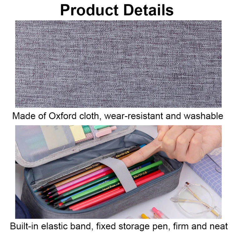 Gemaakt van slijtvast en wasbaar Oxford cloth, met een gladde rits die niet loslaat. Binnenin zit een elastische band om pennen en potloden netjes op hun plek te houden.