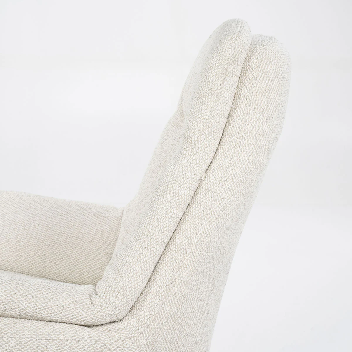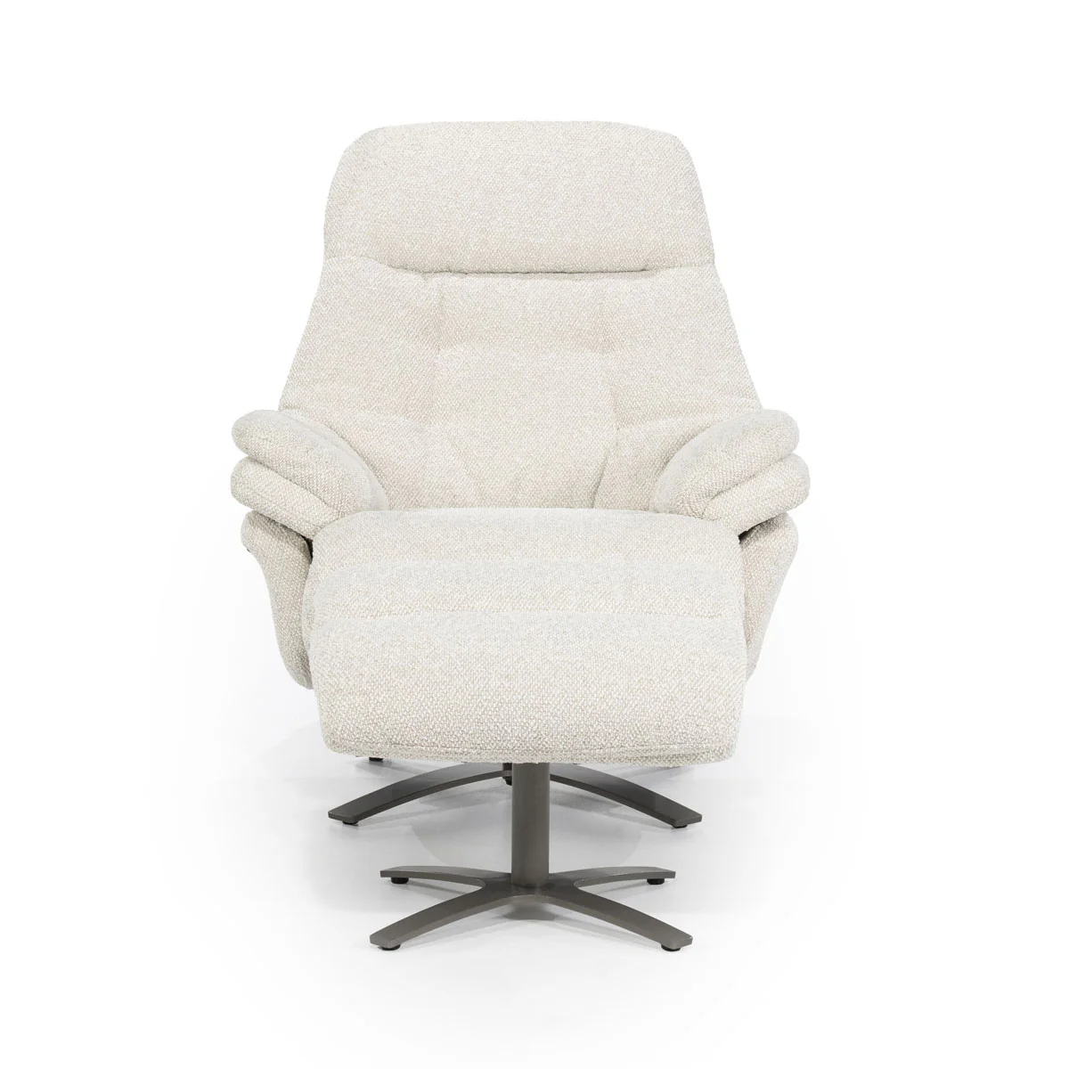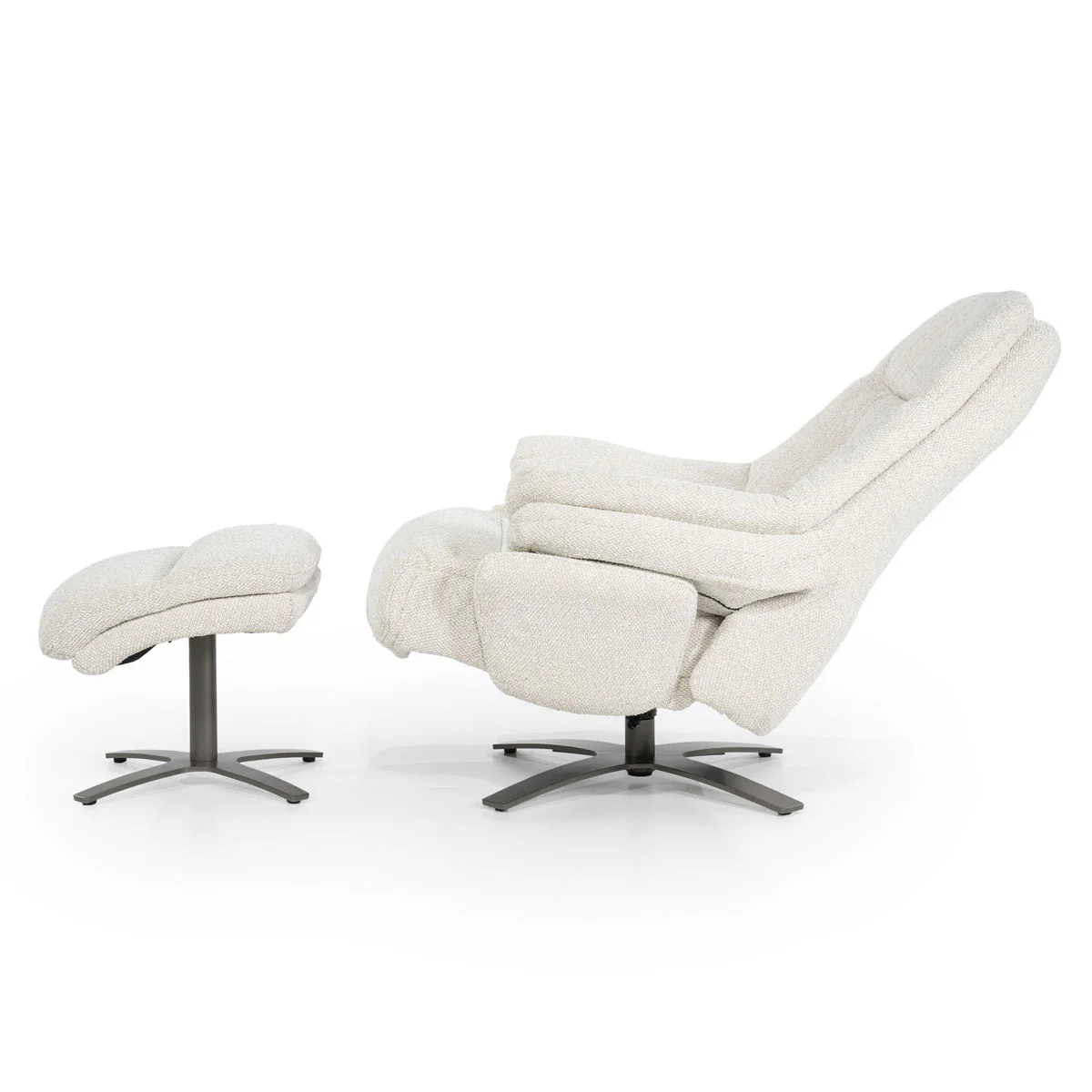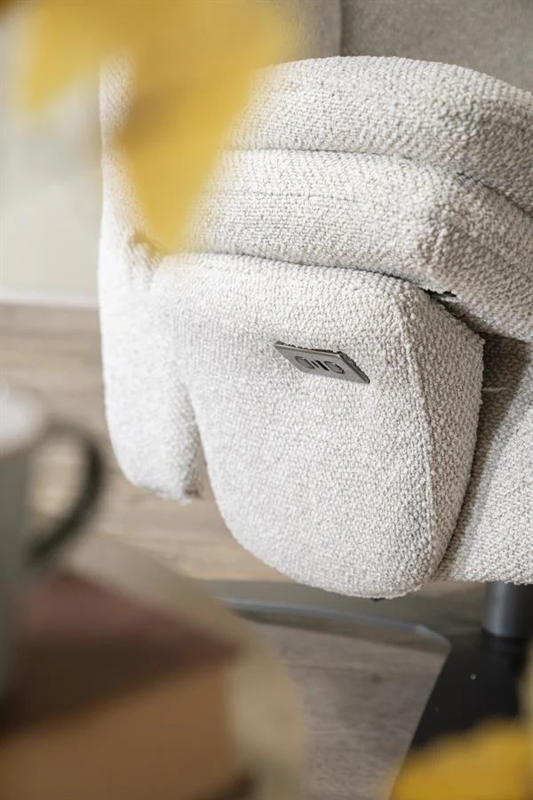 De fauteuil Caleb is uitgevoerd met een stoffen bekleding en een ijzeren frame. De beige kleur zorgt voor een rustige en tijdloze uitstraling. Deze draaibare fauteuil is elektrisch verstelbaar en voorzien van een geïntegreerd USB- en USBC-laadstation, wat zorgt voor extra comfort en gebruiksgemak. De bijpassende kruk maakt de fauteuil geschikt om ontspannen te zitten in de woonkamer of relaxruimte.