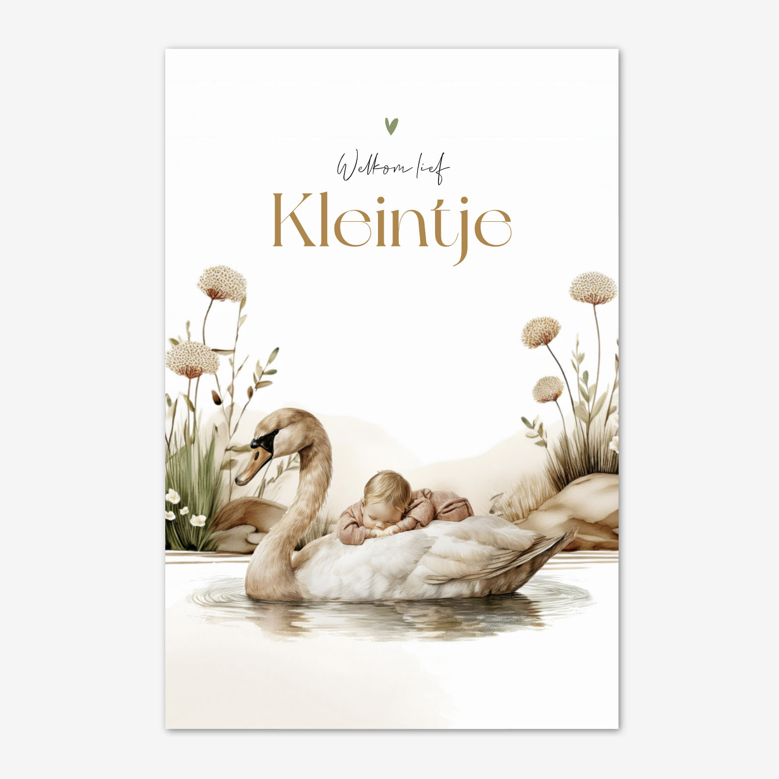 Maak je kraamcadeau extra bijzonder met deze enkelvoudige wenskaart, voorzien van een liefdevolle illustratie van een zwaan met baby. De tekst “Welkom op de wereld, kleintje” maakt deze kaart perfect om je felicitaties over te brengen bij de geboorte van een baby.