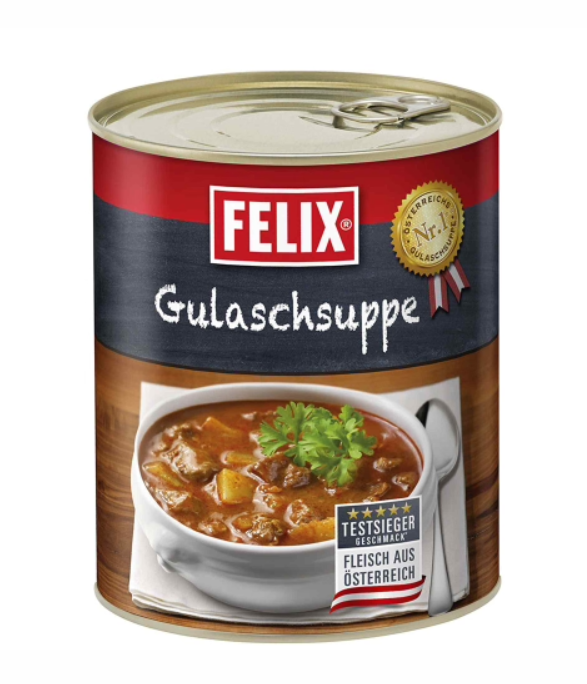 Voor wie het liever wat pittiger heeft, is er ook de variant Felix Goulashsuppe Höllenfeuer – een vurige versie die z’n naam eer aandoet.