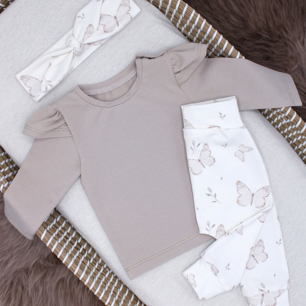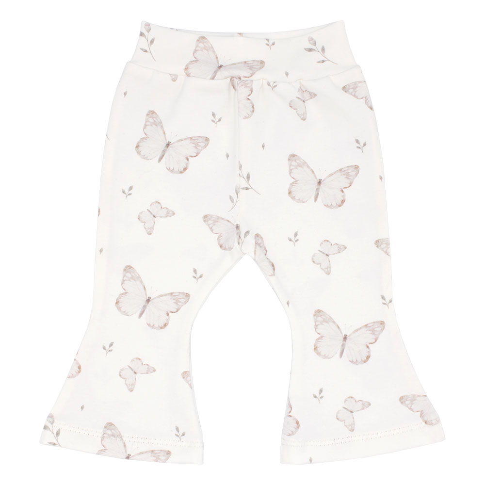 Het flared broekje Butterflies is een Off-White (gebroken wit) broekje bedrukt met vlinders en kleine bloemetjes. Het broekje valt als een legging en heeft wijd uitlopende pijpen. De taille is afgewerkt met een brede en comfortabele tailleband. Verkrijgbaar in de maat 50 t/m 80. Je kunt het broekje combineren met het shirtje Sand en het haarbandje en/of mutsje Butterflies.