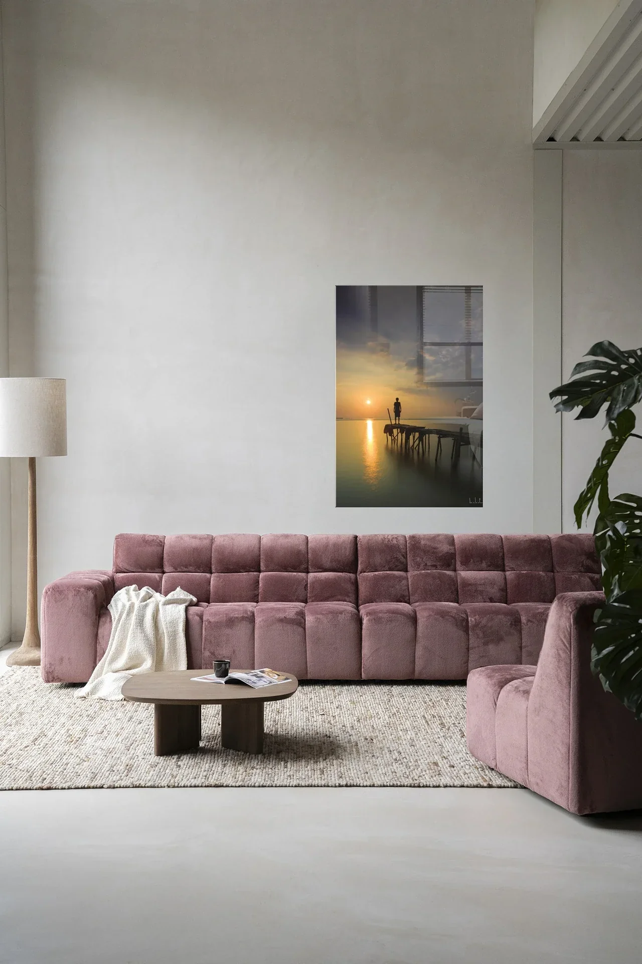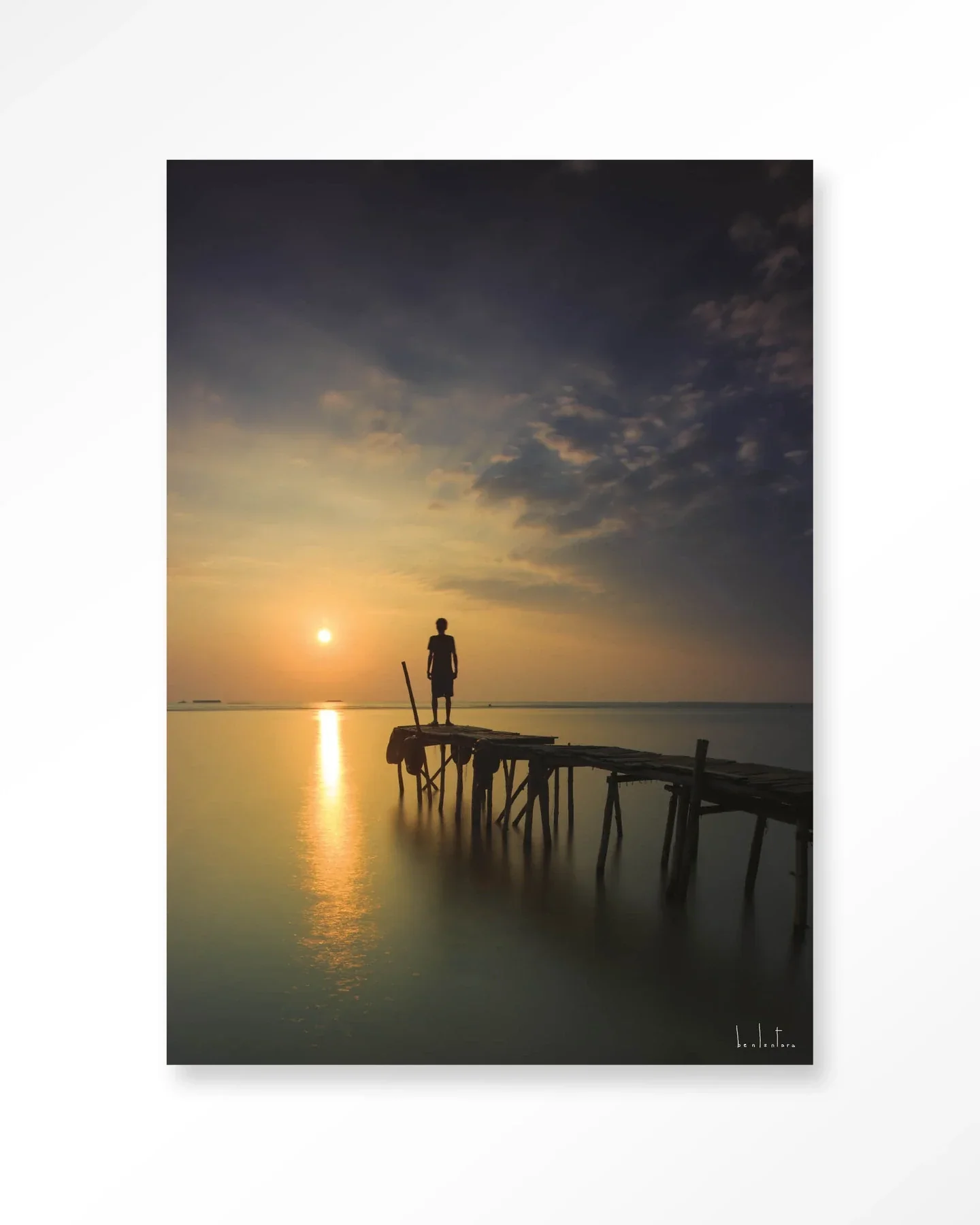 Een sfeervolle zonsopgang boven een houten pier, vastgelegd in warme, gouden tinten. Dit kunstwerk brengt rust en romantiek in huis, perfect om een kalmerend accent toe te voegen aan een slaapkamer of meditatieruimte.