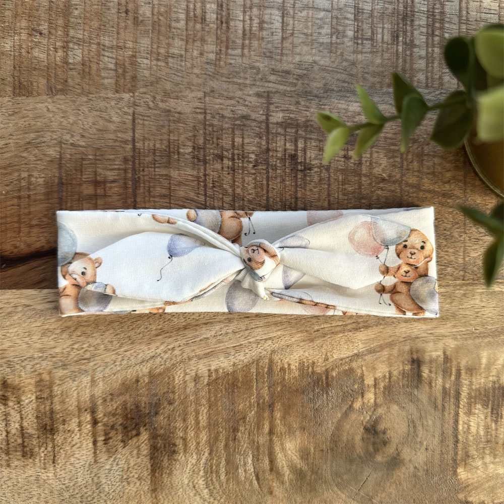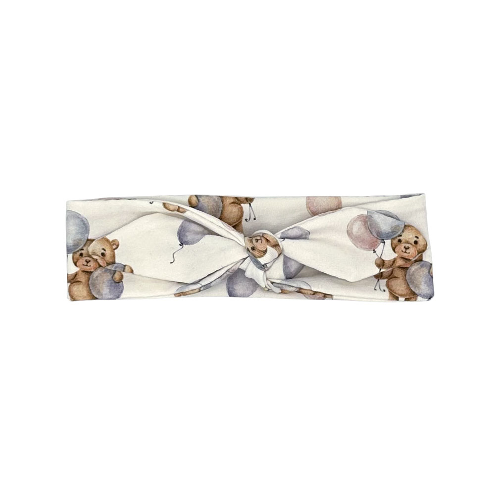Het haarbandje Partybear is een Off-White (gebroken wit) haarbandje bedrukt met teddybeertjes & ballonnen en is eenvoudig door uzelf te knopen. Het haarbandje is geschikt voor kindjes tot ongeveer 1 jaar en te combineren met het boxpakje en/of broekje Partybear.