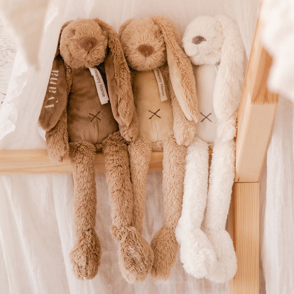 Ontdek de leuke Happy Horse knuffel Rabbit Richie. Dit konijn is een echte musthave voor kleintjes. Hij is zéér geliefd en heerlijk zacht om mee te knuffelen! De knuffel is 38 cm lang en op het oor van het konijn kan een naam geborduurd worden. Dit maakt het knuffelkonijn nog persoonlijker! Vul de naam in, kies het lettertype en de kleur van het lettertype om jouw konijn te personaliseren.