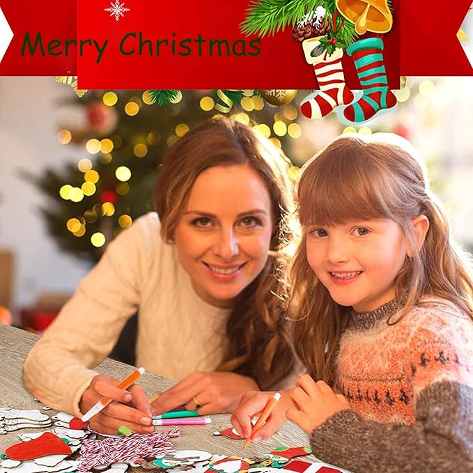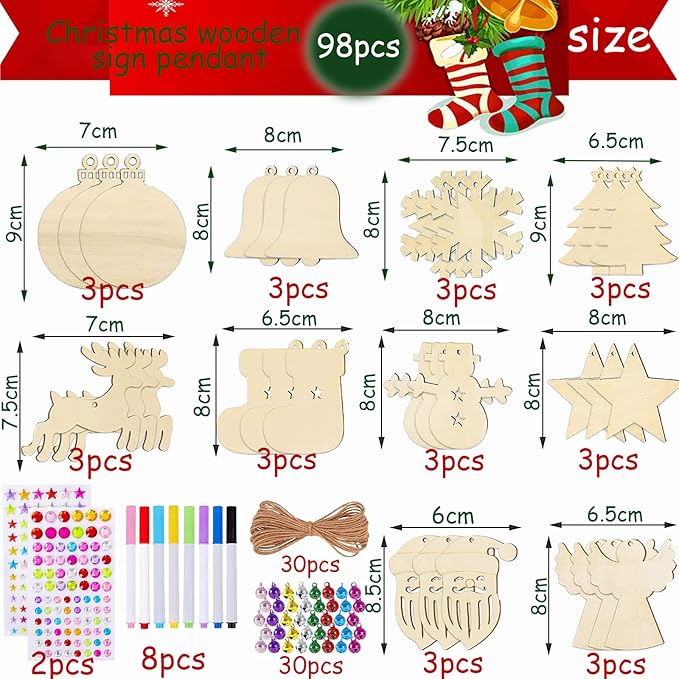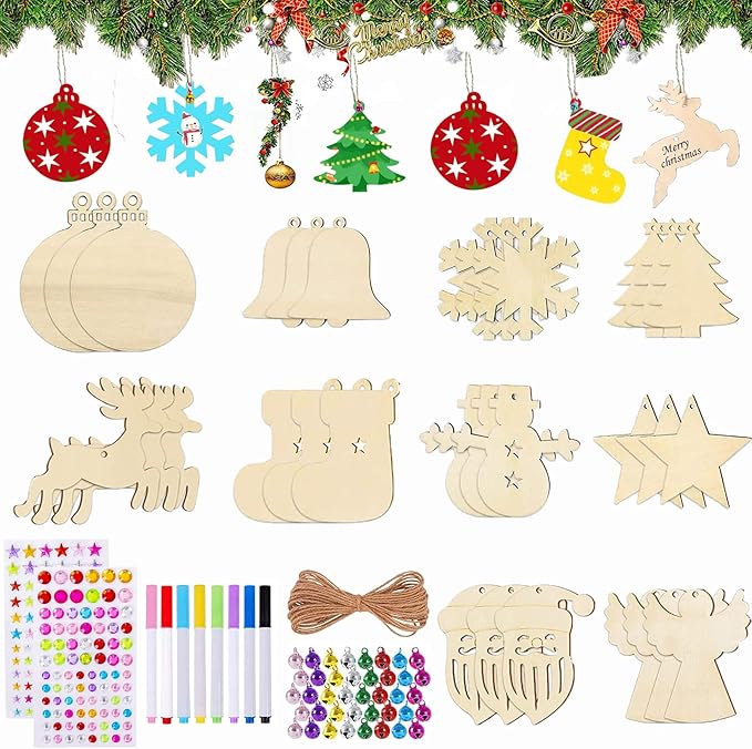 Breng de feestdagen tot leven met deze uitgebreide set van 100 houten kerstboomdecoraties. Perfect voor kinderen en volwassenen om samen unieke kerstversieringen te maken!