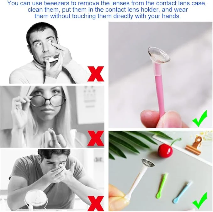 Deze complete set van 10 contactlenshulpen is perfect voor het veilig en hygiënisch inzetten en verwijderen van contactlenzen. De set bevat handige zuignapjes en pincetjes in vijf verschillende kleuren (groen, blauw, paars, wit en roze), zodat je altijd een schone tool bij de hand hebt. Gemaakt van zacht siliconen en duurzaam kunststof – vriendelijk voor zowel je ogen als je lenzen.