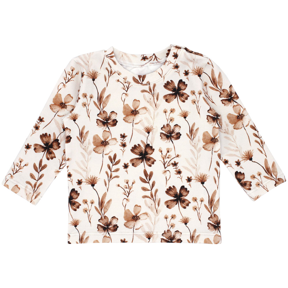 Longsleeve Flower Dream is een crème shirtje bedrukt met mooie bloemen. Dit shirtje heeft lange mouwen en een ronde hals. Daarnaast zitten er op de schouder drukknoopjes wat het aan- en uitkleden makkelijker maakt. Verkrijgbaar in maat 50 t/m 86. Je kunt deze longsleeve leuk combineren met een tuinbroekje, jurkje en/of met de andere Flower Dream items, zoals het broekje, haarbandje en/of mutsje.