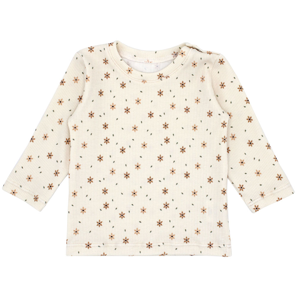 Longsleeve Starflower is een crème shirtje bedrukt met kleine bloemetjes. Dit shirtje heeft lange mouwen en een ronde hals. Daarnaast zitten er op de schouder drukknoopjes wat het aan- en uitkleden makkelijker maakt. Verkrijgbaar in maat 50 t/m 86. Je kunt deze longsleeve leuk combineren met de andere Starflower items, zoals het broekje, haarbandje en/of mutsje.