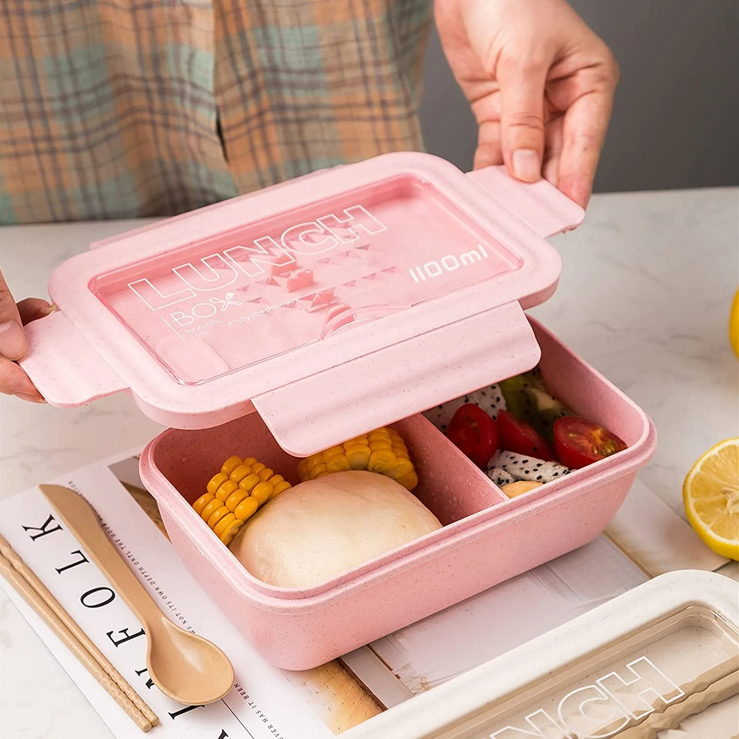 Ga slim én milieuvriendelijk op pad met deze stijlvolle tarwevezel Bento Box van 1100 ml. Gemaakt van herbruikbaar materiaal en BPA-vrij kunststof: ideaal voor school, werk of onderweg. Lekvrij dankzij de siliconen sealing en vier stevige clips, dus zonder gedoe in je tas.