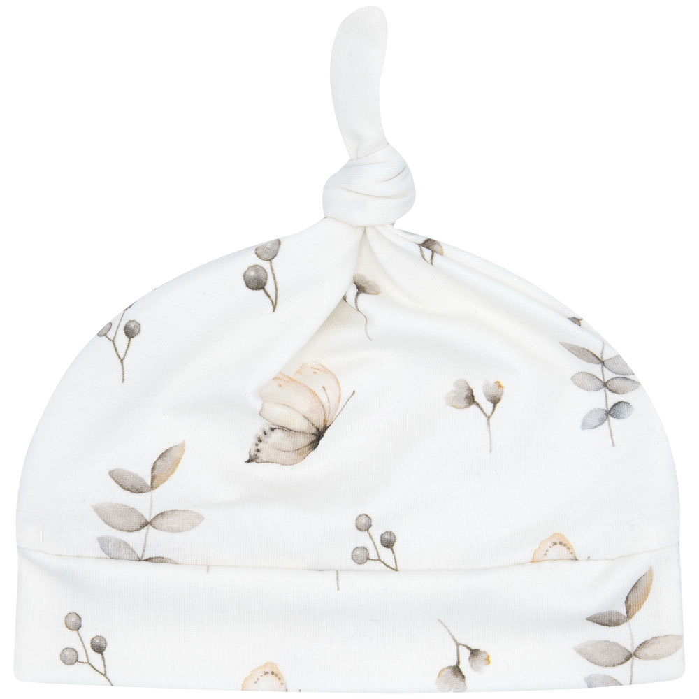 Het mutsje Butterflies & Twigs is een Off-White (gebroken wit) knoopmutsje bedrukt met mooie bloemen. Dit mutsje heeft een knoopje bovenop waarmee u zelf eenvoudig de maat iets kunt verstellen. Verkrijgbaar in One Size: 0 – 3 maanden en te combineren met het boxpakje en/of broekje Butterflies & Twigs.