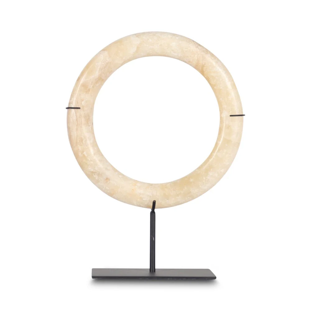 Voeg een opvallend en stijlvol accent toe aan je interieur met dit onyx ring ornament op voet. Gemaakt van natuurlijk onyx, is elk exemplaar uniek dankzij de prachtige, natuurlijke kleurnuances en patronen. Het ornament combineert kunst en elegantie, waardoor het zowel een decoratief object als een gespreksstarter is.