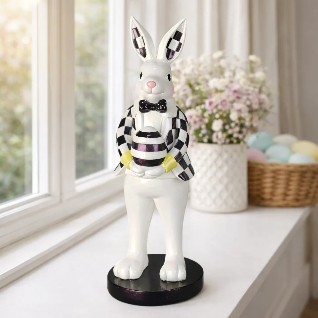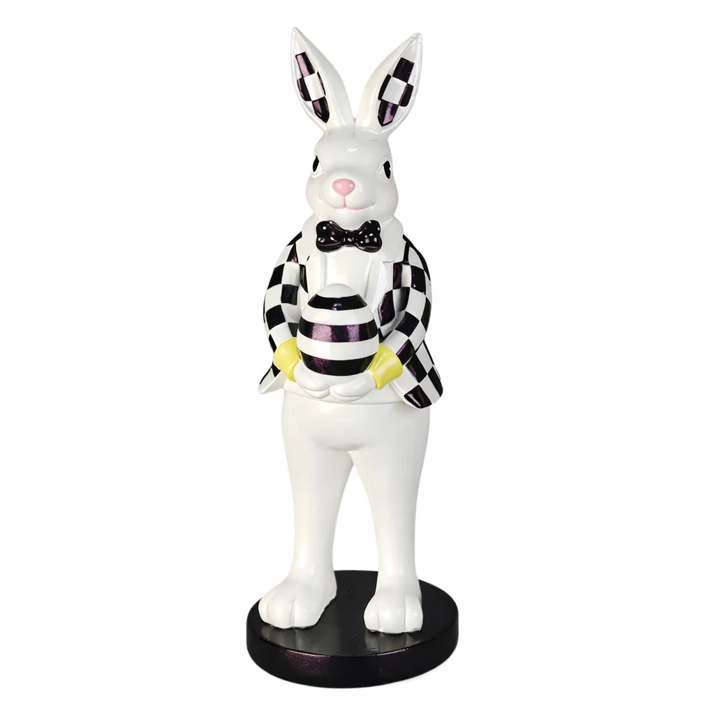 Deze elegante paas haas in zwart-wit uitvoering is een stijlvolle blikvanger binnen je voorjaarsdecoratie. Het contrasterende ruitpatroon, de zwarte vlinderstrik en het gestreepte paasei geven het beeld een moderne en luxe uitstraling.