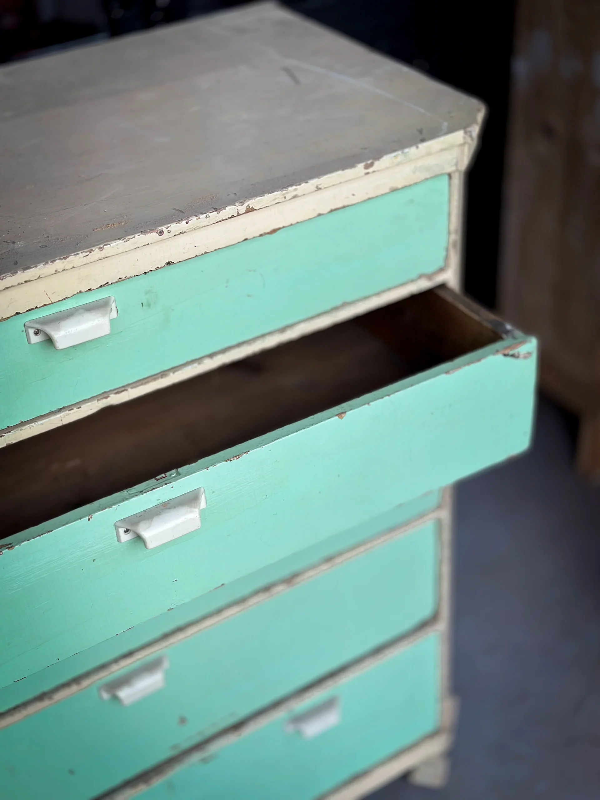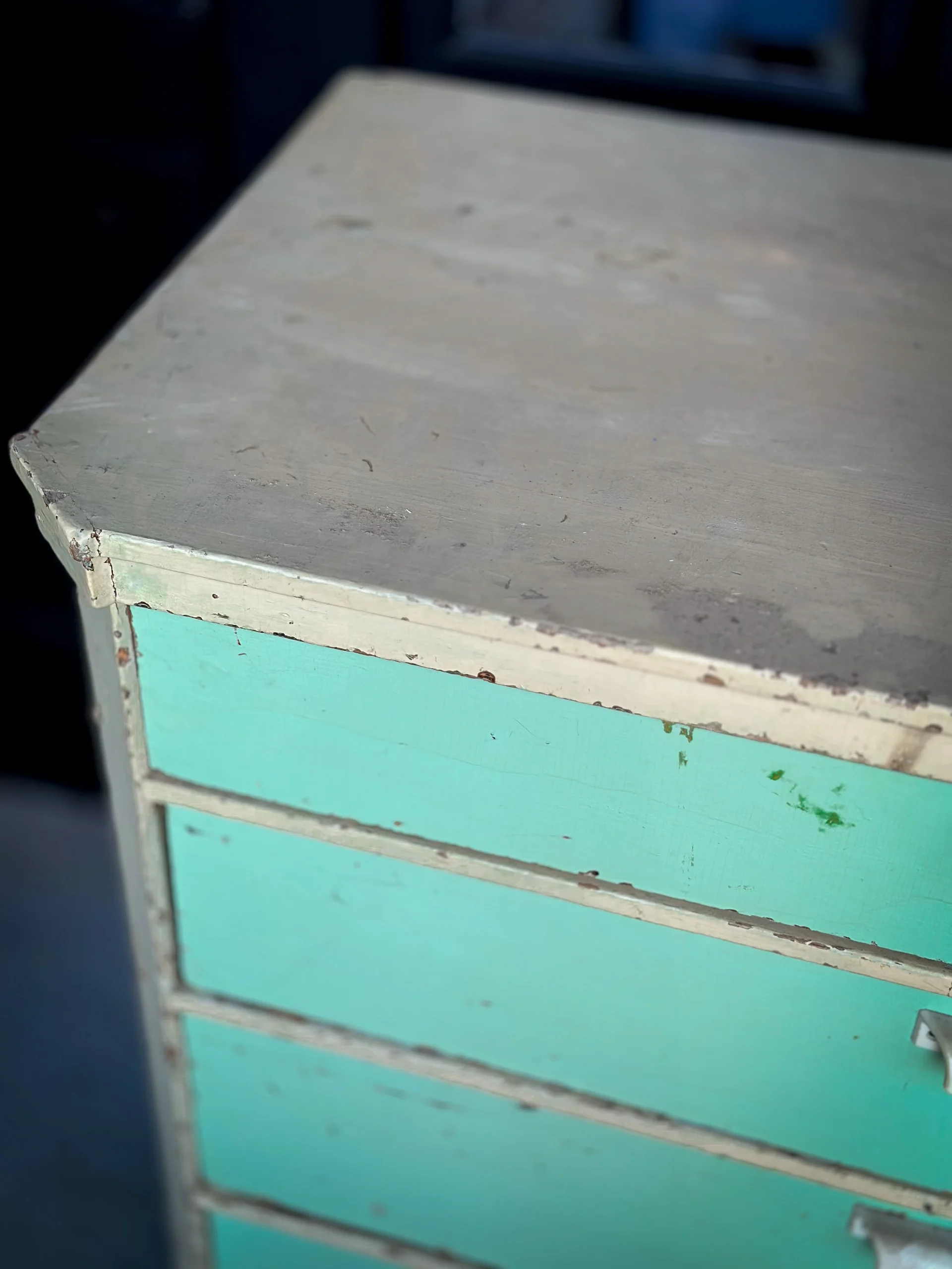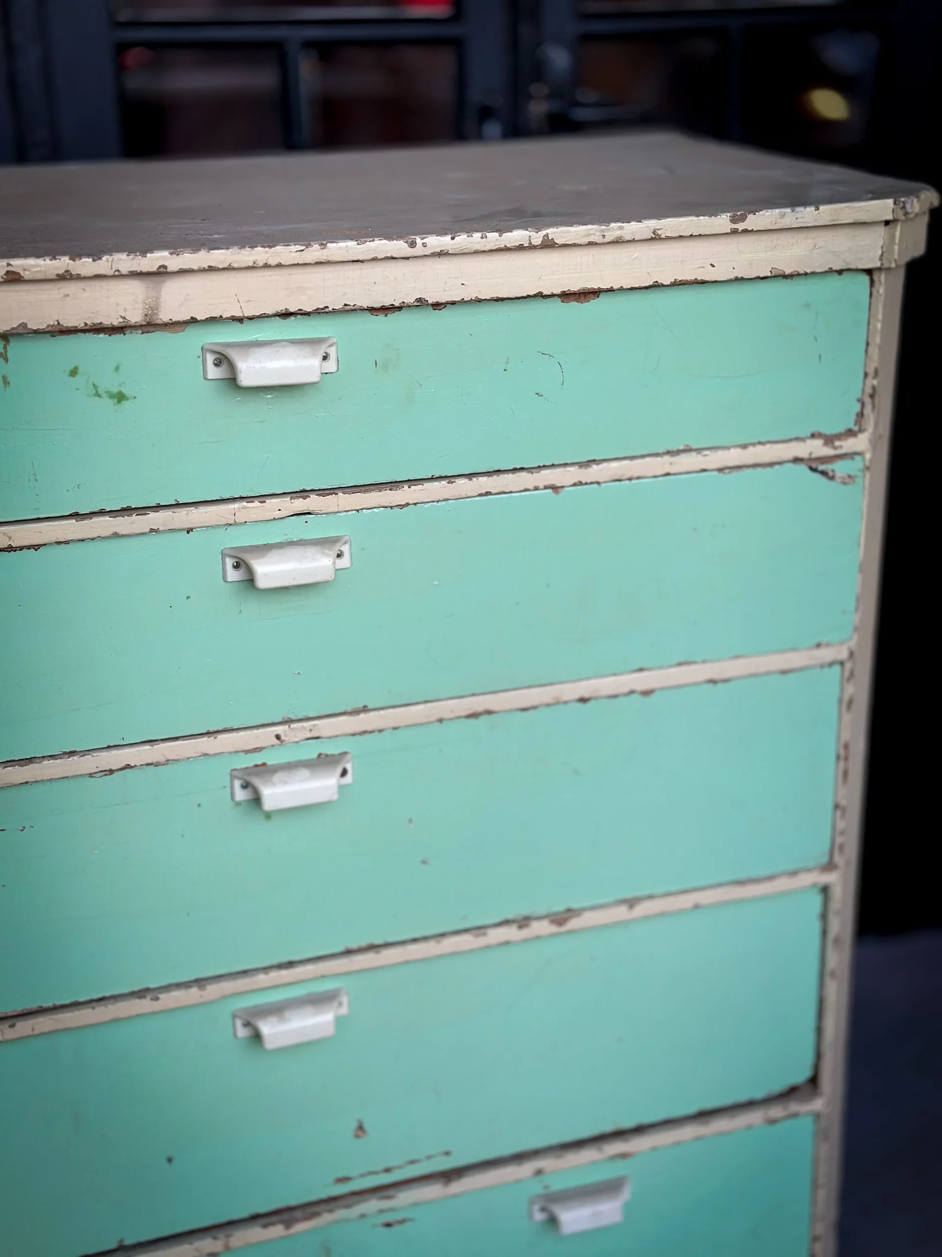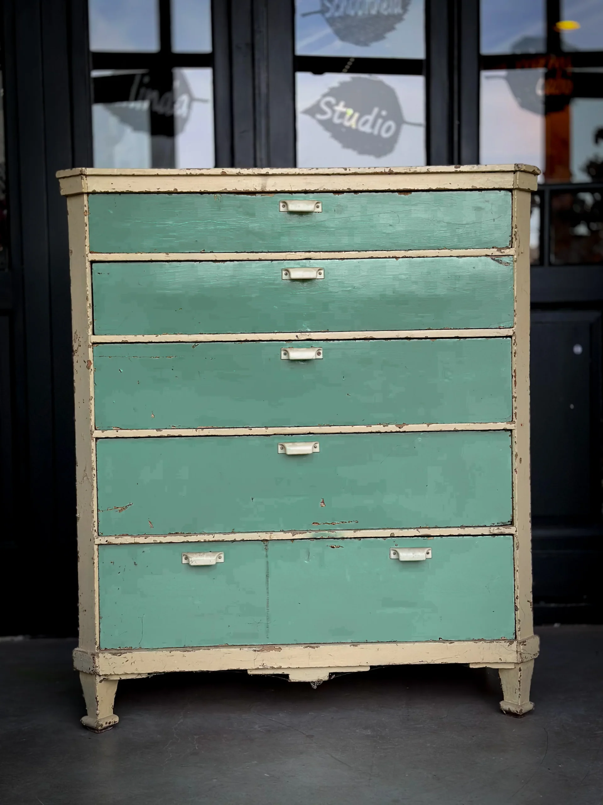 Deze prachtige retro vintage ladekast in mintgroen en beige is een echte blikvanger met zijn stijlvolle, tijdloze uitstraling. De kast heeft royale afmetingen van H117 x D52 x B101 cm, waardoor hij niet alleen charmant oogt, maar ook veel opbergruimte biedt. Perfect om jouw interieur een unieke, karaktervolle touch te geven!