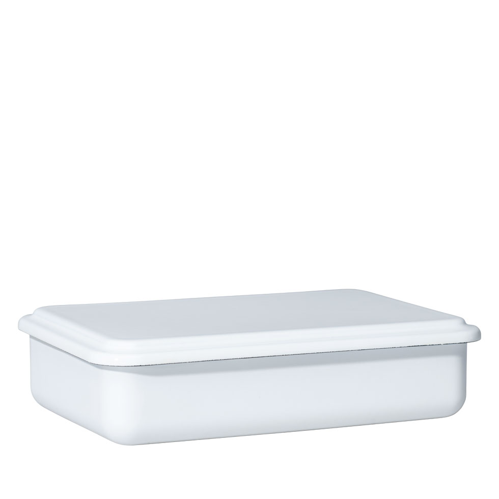 De multifunctionele bewaardozen bestaan ​​uit een rechthoekige emaille bewaardozen met een emaille deksel.