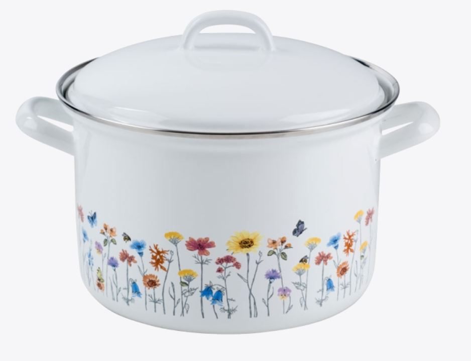Deze hoge pan is gemaakt van natuurlijk emaille en voorzien van een vrolijk bloemenmotief, geïnspireerd op een alpenweide in volle bloei. Dankzij het duurzame materiaal en de doordachte vorm is dit de ideale pan voor gerechten met veel vocht, zoals soep, groenten, pasta of stoofschotels.