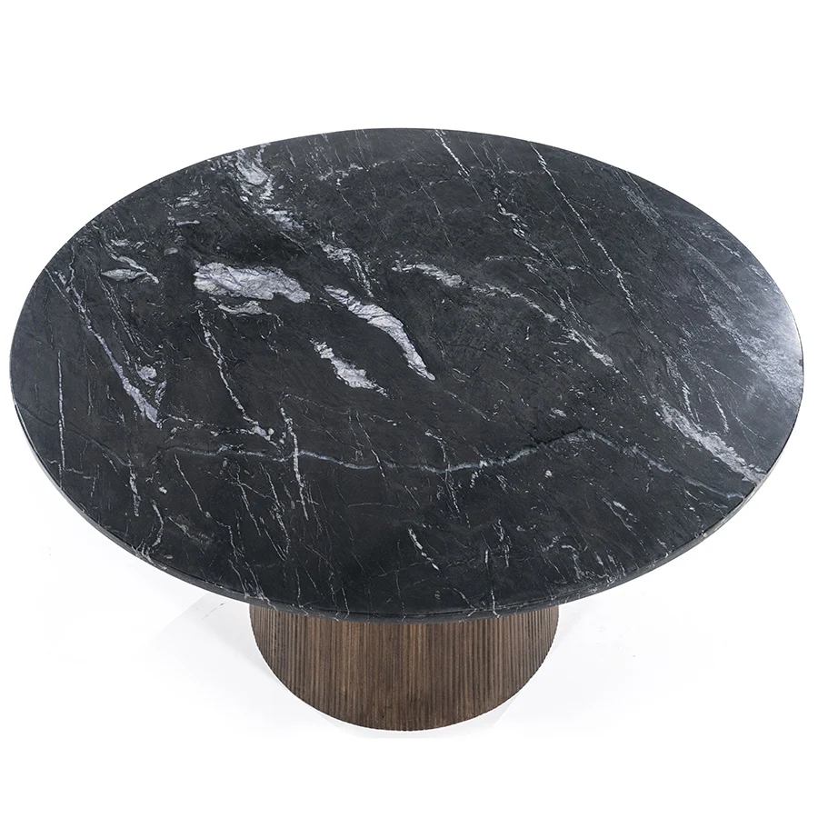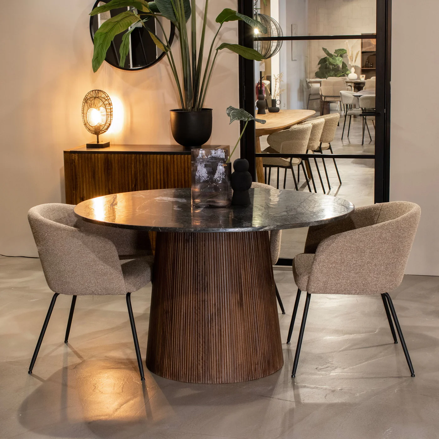 De ronde eettafel Maxim is uitgevoerd met een mangohouten onderstel en een zwart marmeren tafelblad. De combinatie van hout en marmer geeft de tafel een luxe en tijdloze uitstraling. Dankzij het ronde ontwerp ontstaat een gezellige eethoek die geschikt is voor dagelijks gebruik. Marmer is een natuurproduct, waardoor ieder tafelblad uniek is en licht kan afwijken in kleur en tekening.