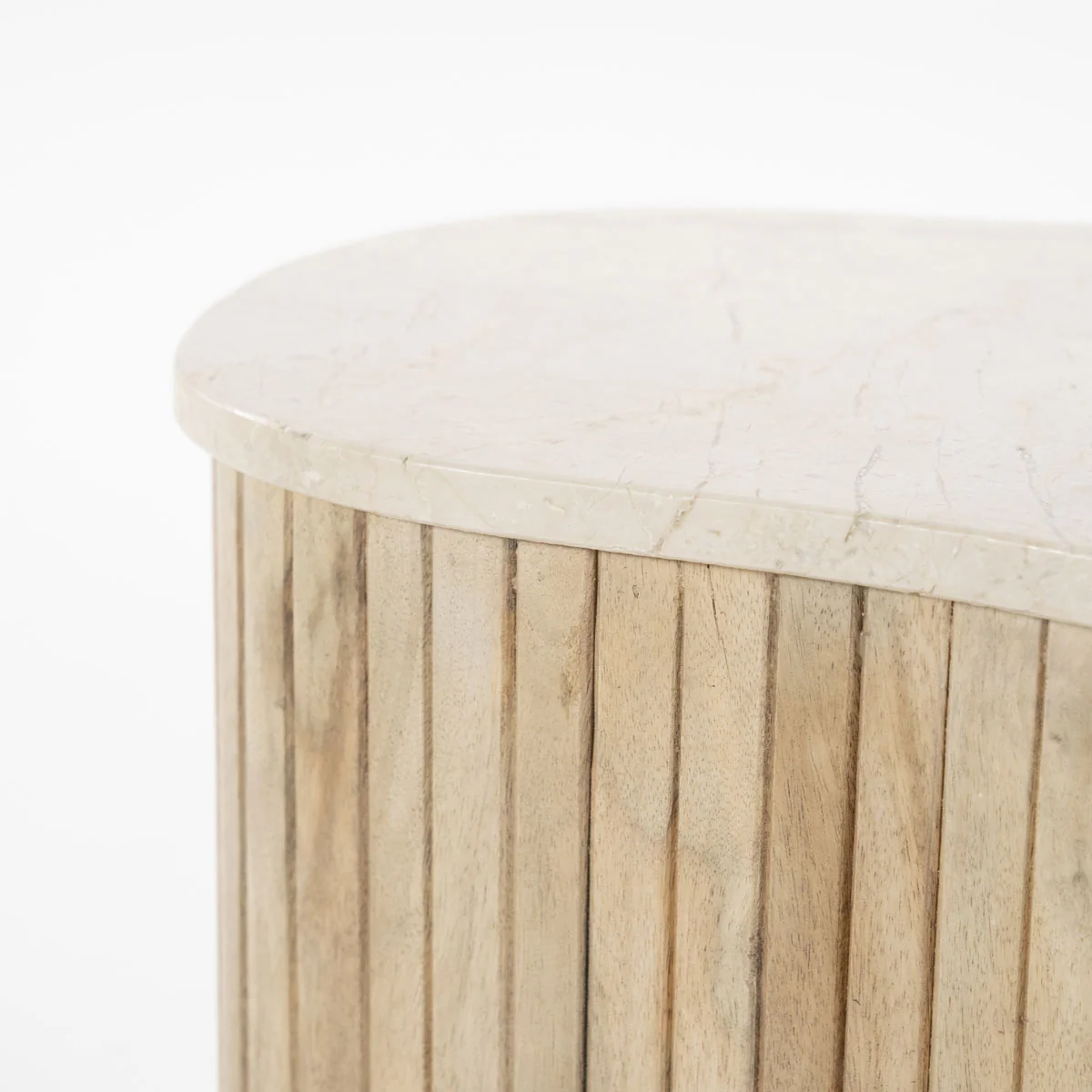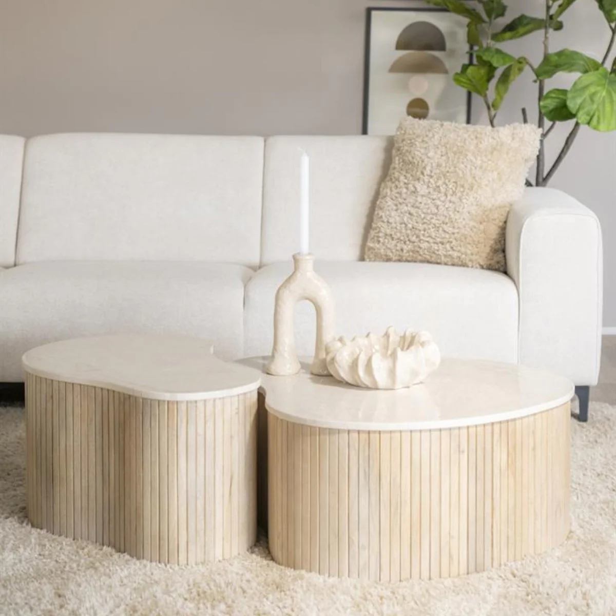 De salontafel Kira small is een compacte tafel met een marmeren blad en een onderstel van mangohout. Het witte blad gecombineerd met het naturel onderstel zorgt voor een frisse en natuurlijke uitstraling. Dankzij het slanke formaat is deze tafel ideaal als bijzettafel of als aanvulling op een grotere salontafel.