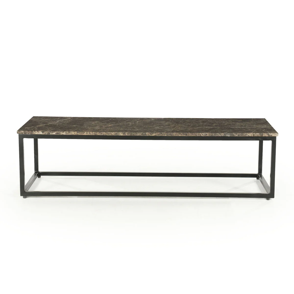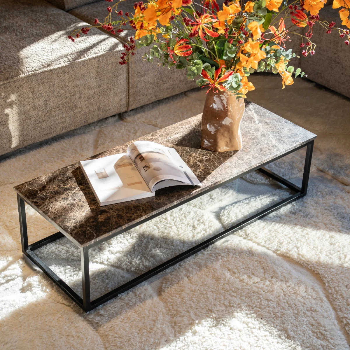 De salontafel Rico is een rechthoekige tafel met een marmeren blad en een ijzer frame. Het bruine tafelblad in combinatie met het gecoate onderstel geeft de tafel een moderne en natuurlijke uitstraling. Door het slanke formaat is de tafel geschikt voor gebruik in de woonkamer. Marmer is een natuurproduct, waardoor ieder blad uniek is en licht kan afwijken.