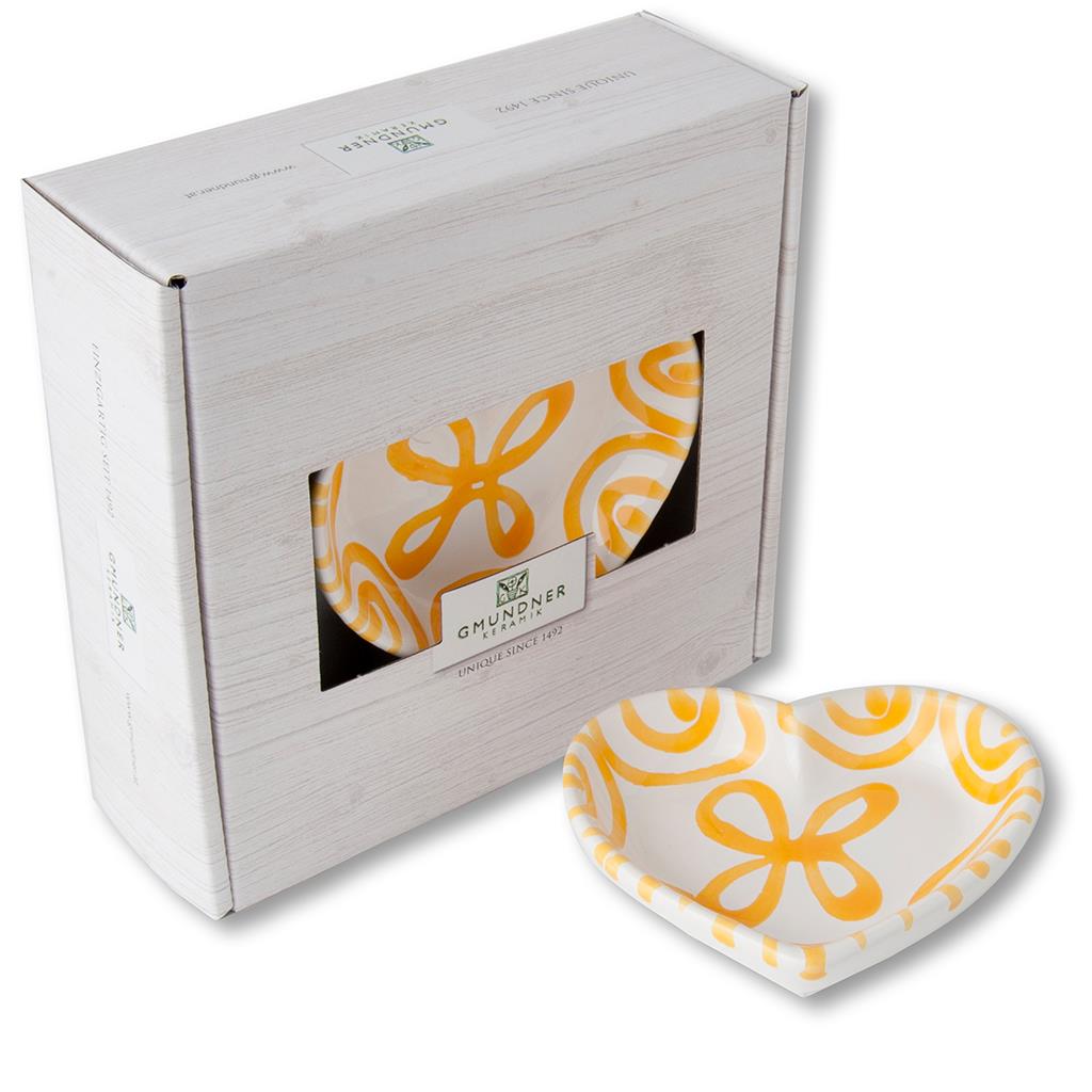 Schaaltje hart – Gevlamd geel – 10 cm – cadeauverpakking