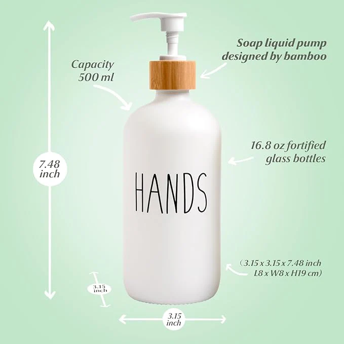 Geef je keuken of badkamer een stijlvolle upgrade met deze set van 2 glazen zeepdispensers, inclusief een bijpassende bamboe tray. Met een mat witte afwerking en duidelijke labels voor “HANDS” en “DISHES”, combineert dit setje functionaliteit met een elegant design.