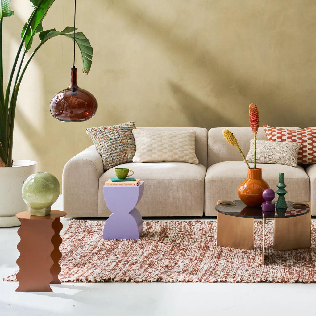 Throughout its interior collections, Urban Nature Culture has used the hourglass shape as a source of inspiration various times. A symbol of time and the constant balancing game it brings along – it’s a great reminder that, no matter how many adventures await you, it’s important to take a breather every once in a while. Side table Corvo, handmade by Indian artisans from sturdy, beautiful mango wood, rocks that hourglass shape, but with a geometric approach. Corvo was given a gorgeous opaque colour finish, in a brand new orchid bloom colour, easily blending into an urban interior.