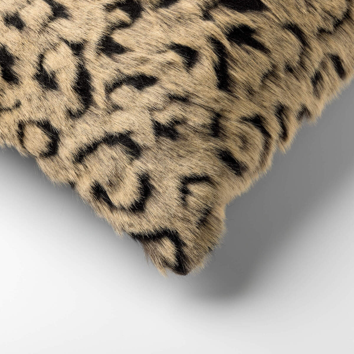 Stijlvolle set sierkussens met zachte panterprint in warme bruintinten. De voorkant is gemaakt van imitatiebont, de achterkant is effen zwart. Perfect als luxe accent op je bank of bed.