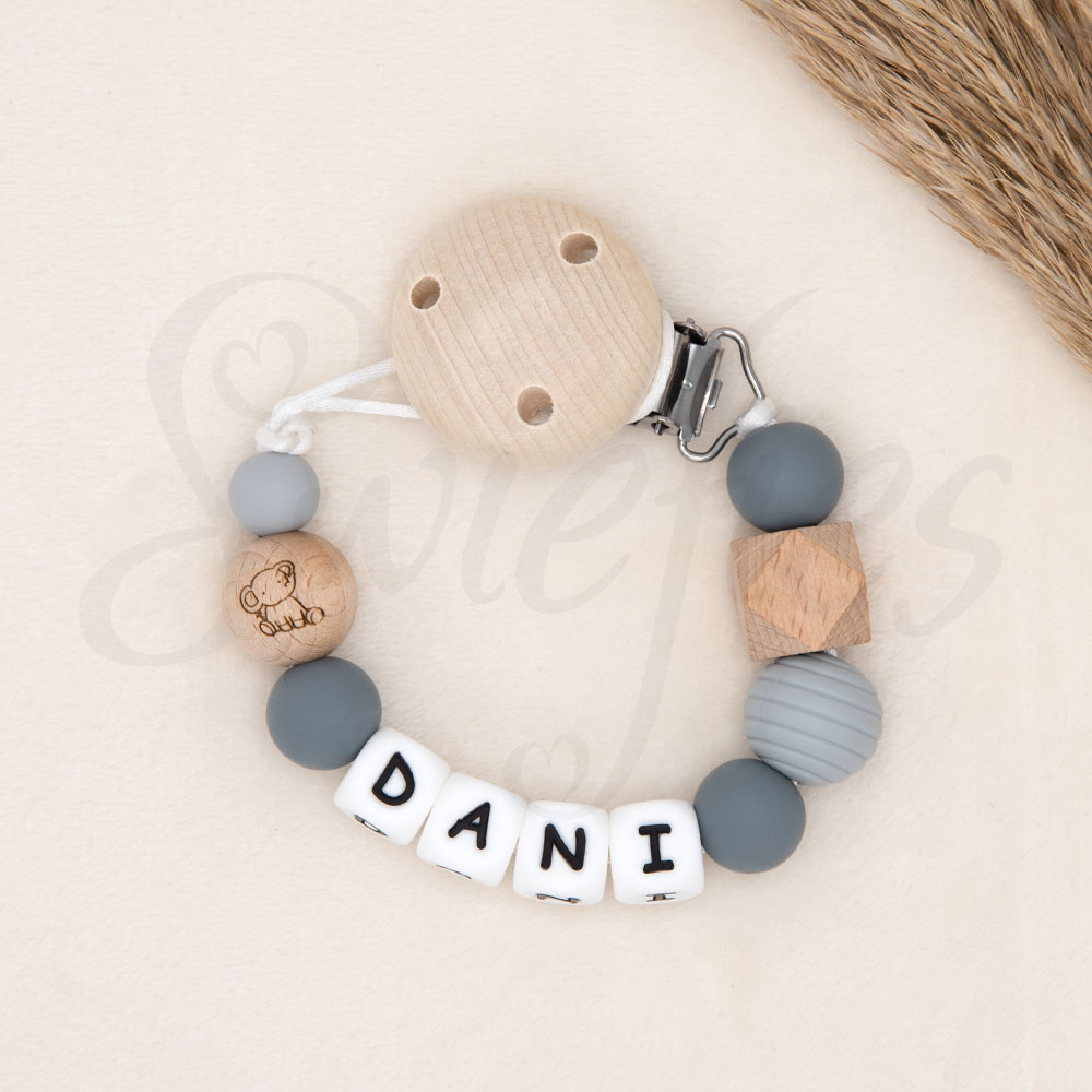 SPEENKOORD met naam | Dani | Olifantje, Grijs, Lichtgrijs, Hout