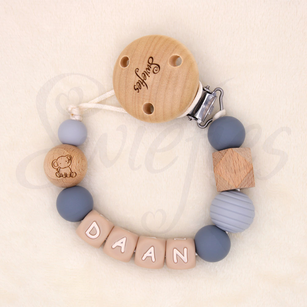 De samenstelling van dit speenkoord kan veranderen bij een naamlengte groter dan 4 letters. Heeft jouw kindje een lange naam? Dan zal Swiefies enkele kralen moeten vervangen voor een letterkraal i.v.m. de maximale veiligheidslengte van 22 cm. Om diezelfde reden hanteert Swiefies een maximum van 6 letters per speenkoord. Is de naam van jouw kindje langer dan 6 letters, dan adviseert Swiefies slechts een deel van de naam of alleen de eerste letter van de naam te gebruiken. We proberen uiteraard altijd de stijl van het speenkoord zoveel mogelijk te behouden!