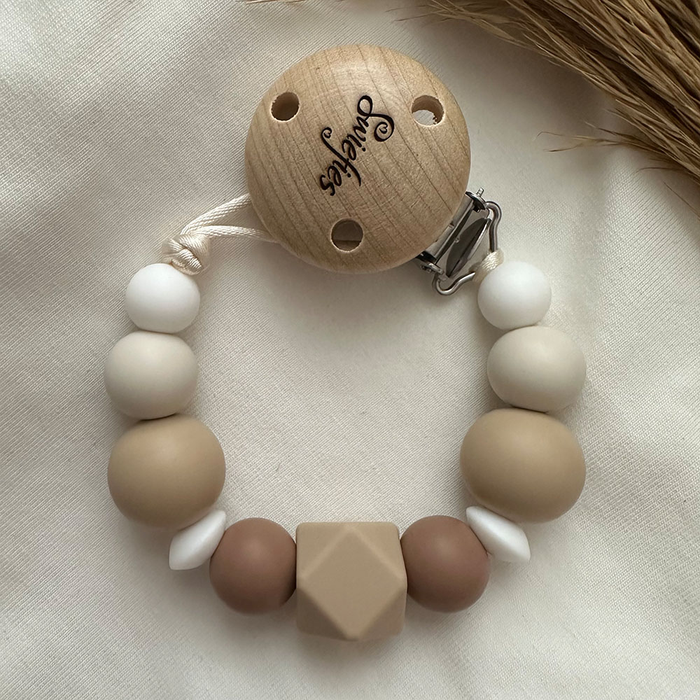 Met een speenkoord van Swiefies kiest u voor een handig, stijlvol én veilig product. Een Swiefies Speenkoord is getest en gecertificeerd volgens de Europese Veiligheidsnorm (NEN-EN 12586). Een Swiefies Speenkoord wordt in Nederland met de hand gemaakt van een stevig satijndraad, siliconen kralen en een houten clip. Al deze materialen zijn getest op de aanwezigheid van schadelijke (chemische) stoffen. Het kan dus geen kwaad wanneer uw kindje het speenkoord in zijn/haar mond stopt, maar let op; een Swiefies Speenkoord is géén (bijt)speelgoed! (Koop dan een Swiefies bijtring).