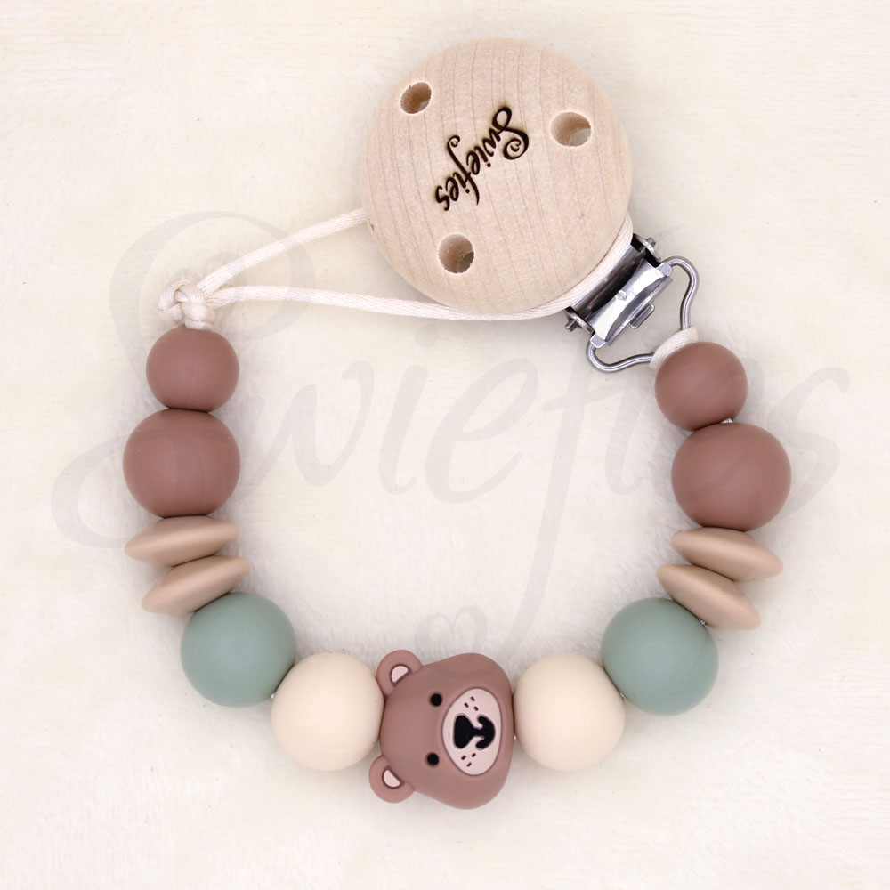 Met een speenkoord van Swiefies kies je voor een handig, stijlvol én veilig product. Een Swiefies speenkoord is getest en gecertificeerd volgens de Europese Veiligheidsnorm (NEN-EN 12586). Een Swiefies speenkoord wordt in Nederland met de hand gemaakt van een stevig satijndraad, siliconen kralen en een houten clip. Al deze materialen zijn getest op de aanwezigheid van schadelijke (chemische) stoffen. Het kan dus geen kwaad wanneer je kindje het speenkoord in zijn/haar mond stopt, maar let op; een Swiefies speenkoord is géén (bijt)speelgoed! (Koop dan een Swiefies bijtring).