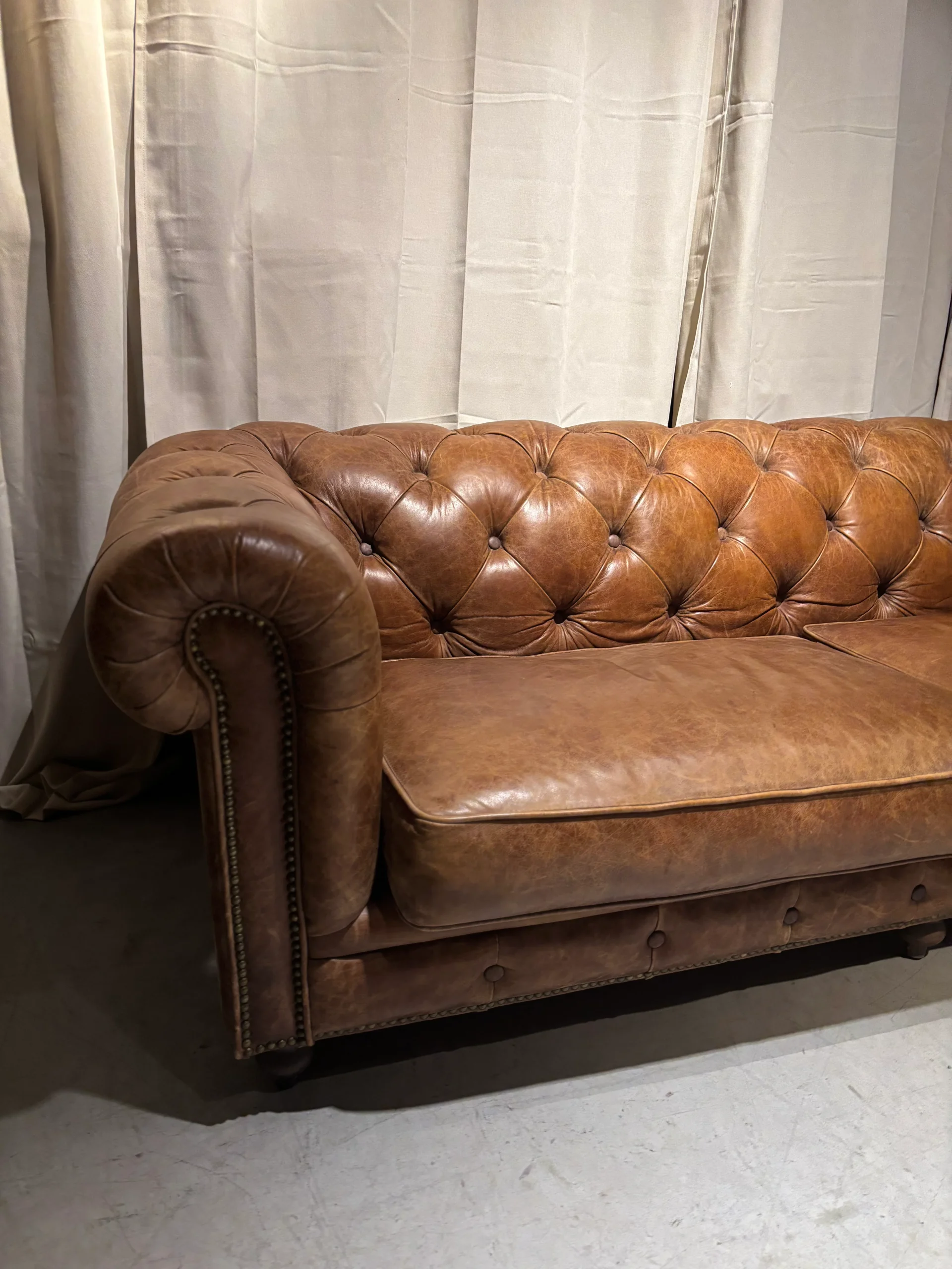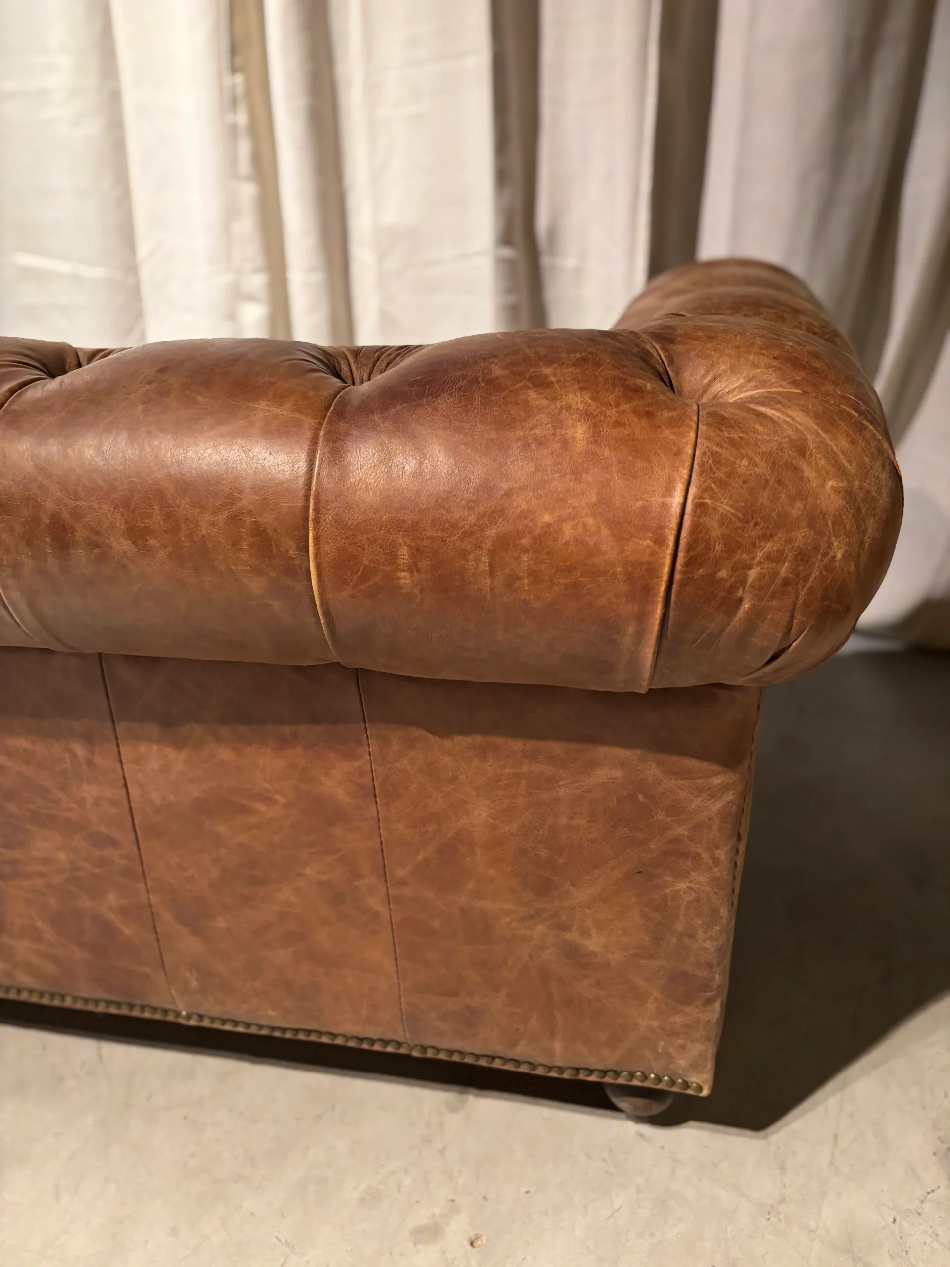 Deze prachtige vintage bruin lederen Chesterfield bank is een echte eyecatcher, met zijn iconische diepe knopen en rijke leer dat in de loop der jaren een mooie patina heeft gekregen. Het royale formaat biedt ongeëvenaard zitcomfort en maakt het de perfecte aanvulling voor een herenkamer of een elegant kantoor. Het klassieke design straalt luxe en verfijning uit, terwijl de robuuste uitstraling de set zijn karakter geeft. Een tijdloze bank dat zowel stijl als functionaliteit naar een hoger niveau tilt