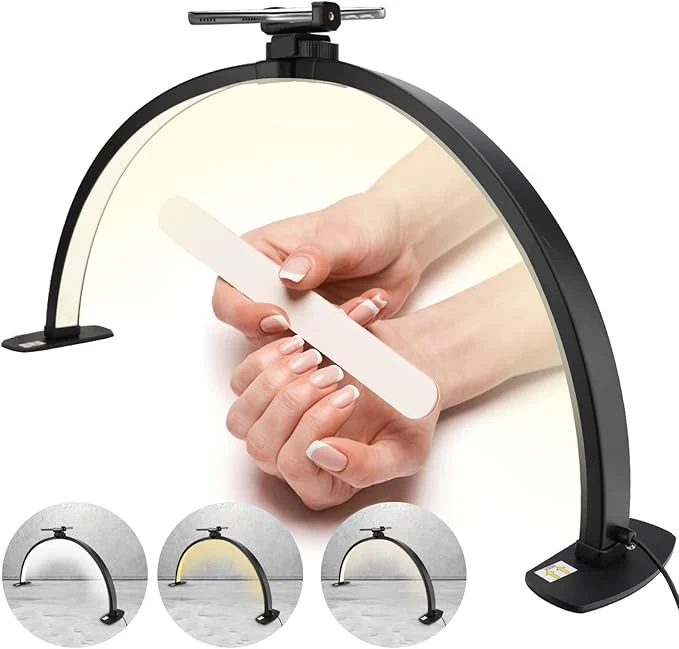 Op zoek naar de perfecte lamp voor jouw beautytafel, studio of werkplek? Deze halvemaan LED tafellamp combineert stijl, functionaliteit en gemak in één compacte oplossing. Dankzij het unieke design en de verstelbare functies is dit dé lamp voor iedereen die werkt met detail en precisie – van nagelstylisten tot content creators.