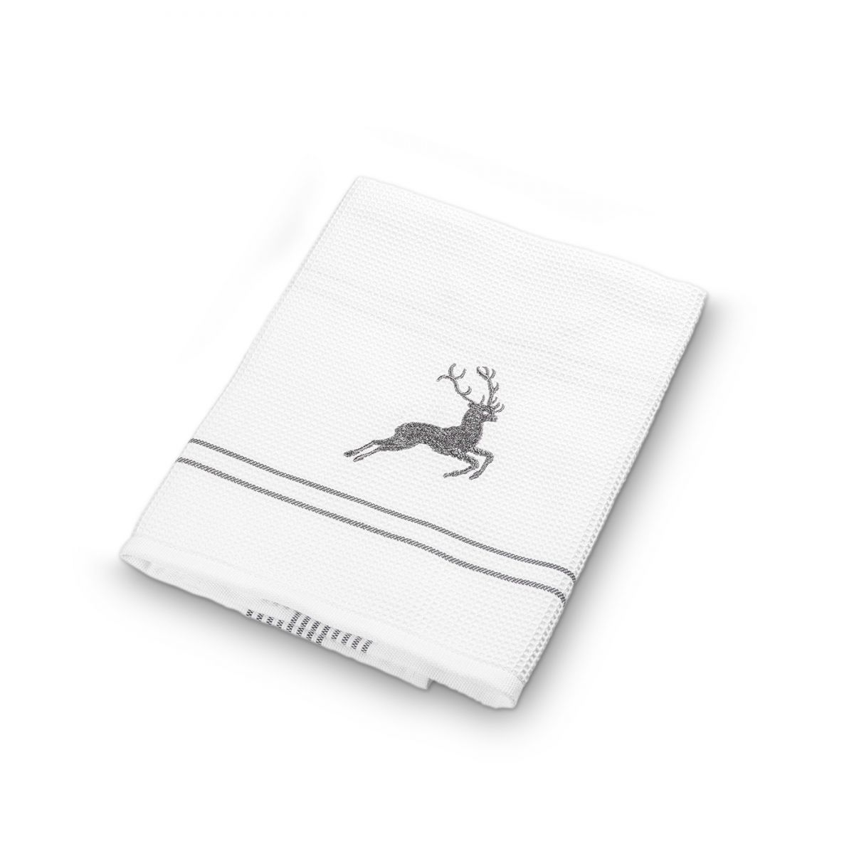 De theedoek in hertendesign van 100% katoen is verkrijgbaar in de drie kleuren groen, grijs en robijnrood. De theedoeken van 50×70 cm drogen de vaat streeploos en pluisvrij.