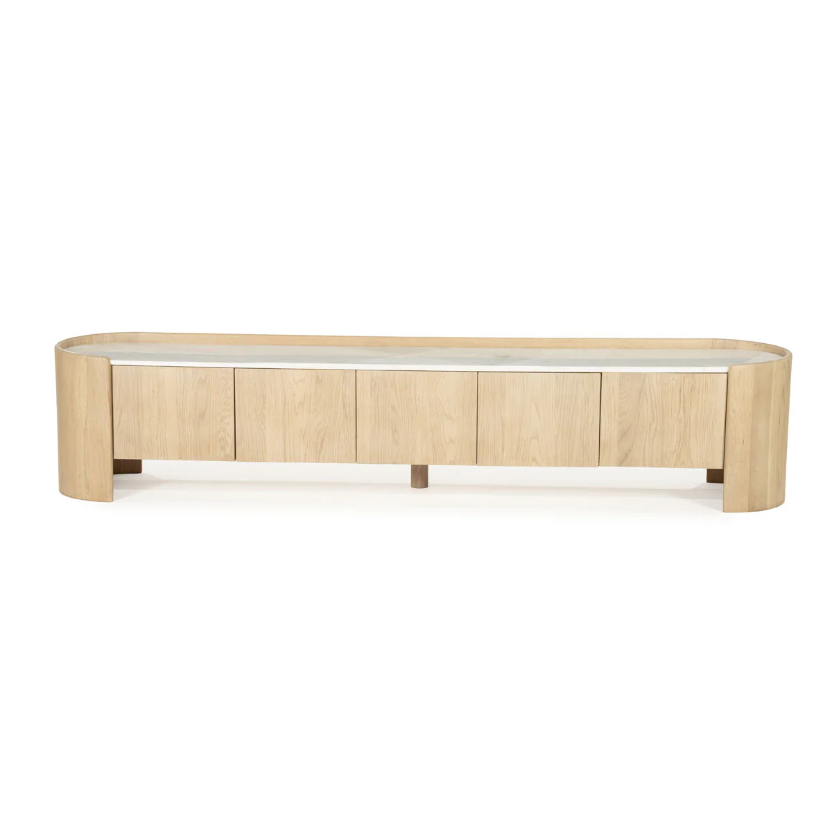 Het TV meubel Don straalt luxe en verfijning uit dankzij de combinatie van eikenhout, eiken fineer en marmer. De naturel kleur en gelakte afwerking zorgen voor een elegante en duurzame uitstraling. Met 5 deuren biedt dit royale meubel volop opbergruimte voor media-apparatuur en accessoires.