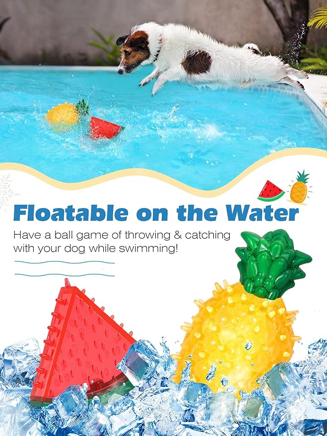 - Uniek Ontwerp: Kleurrijke watermeloen- en ananasvorm met een fluitje erin geïmplanteerd om de aandacht van je hond te trekken en langdurig speelplezier te bieden.