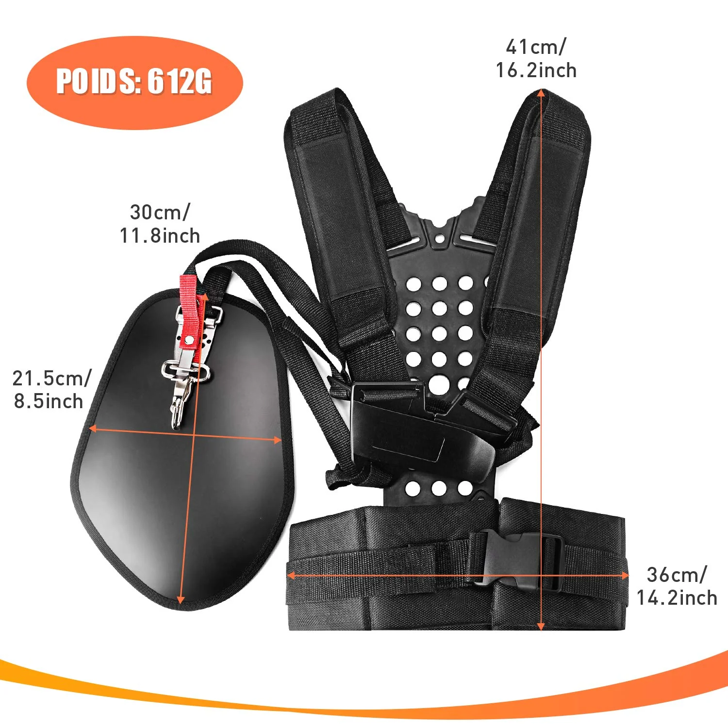 Deze universele draagriem is dé oplossing voor wie vaak werkt met een bosmaaier, grastrimmer of ander zwaar tuingereedschap. Dankzij het dubbele schouderontwerp verdeelt het harnas het gewicht gelijkmatig over je schouders en rug, zodat je comfortabeler en langer kunt werken zonder belasting op je armen of polsen.
