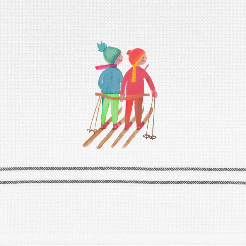 Deze wafeltheedoek met sleeplift is een nieuw ontwerp binnen onze nostalgische ski-serie en laat twee skiërs zien die samen omhoog worden getrokken, een beeld dat in de Alpen steeds minder voorkomt, maar bij velen warme herinneringen oproept. Of juist het gevoel van spierpijn.