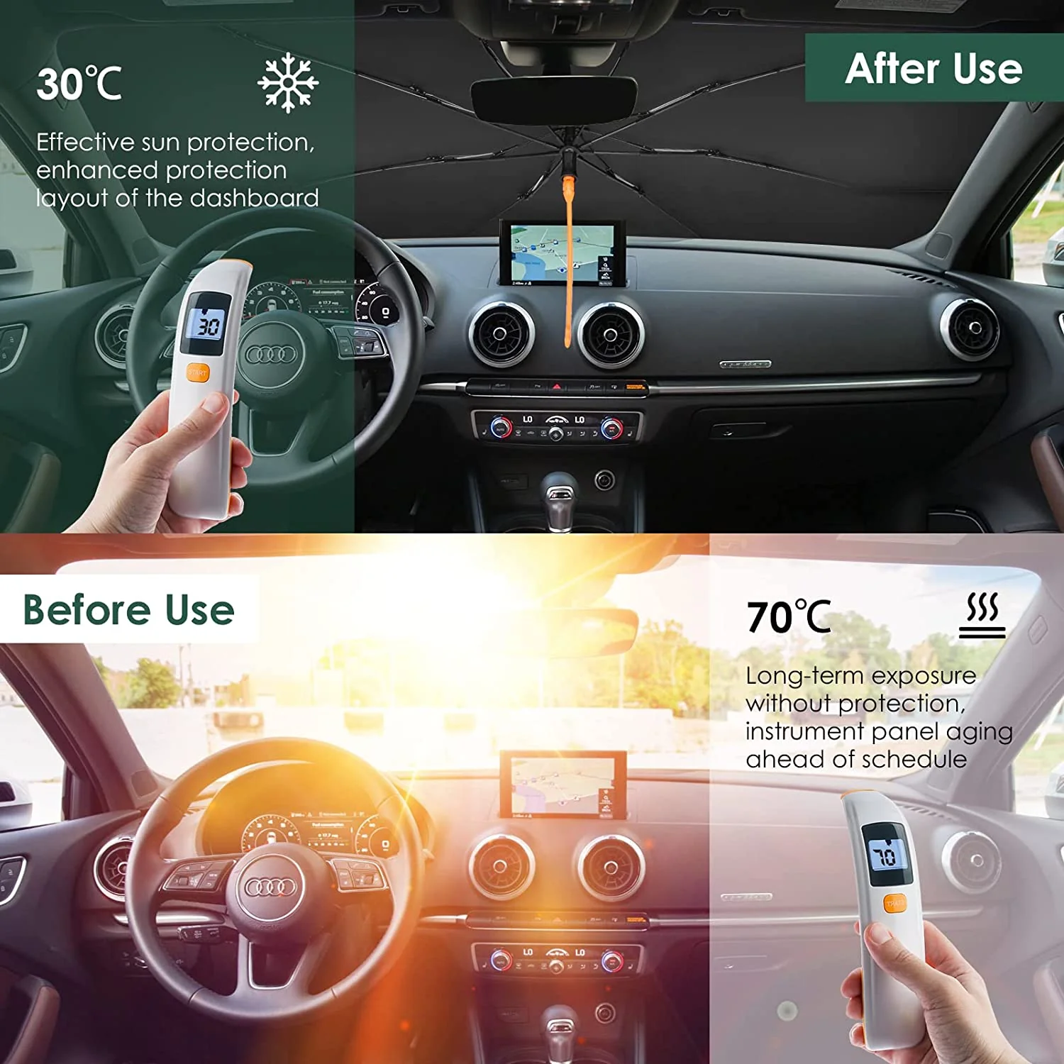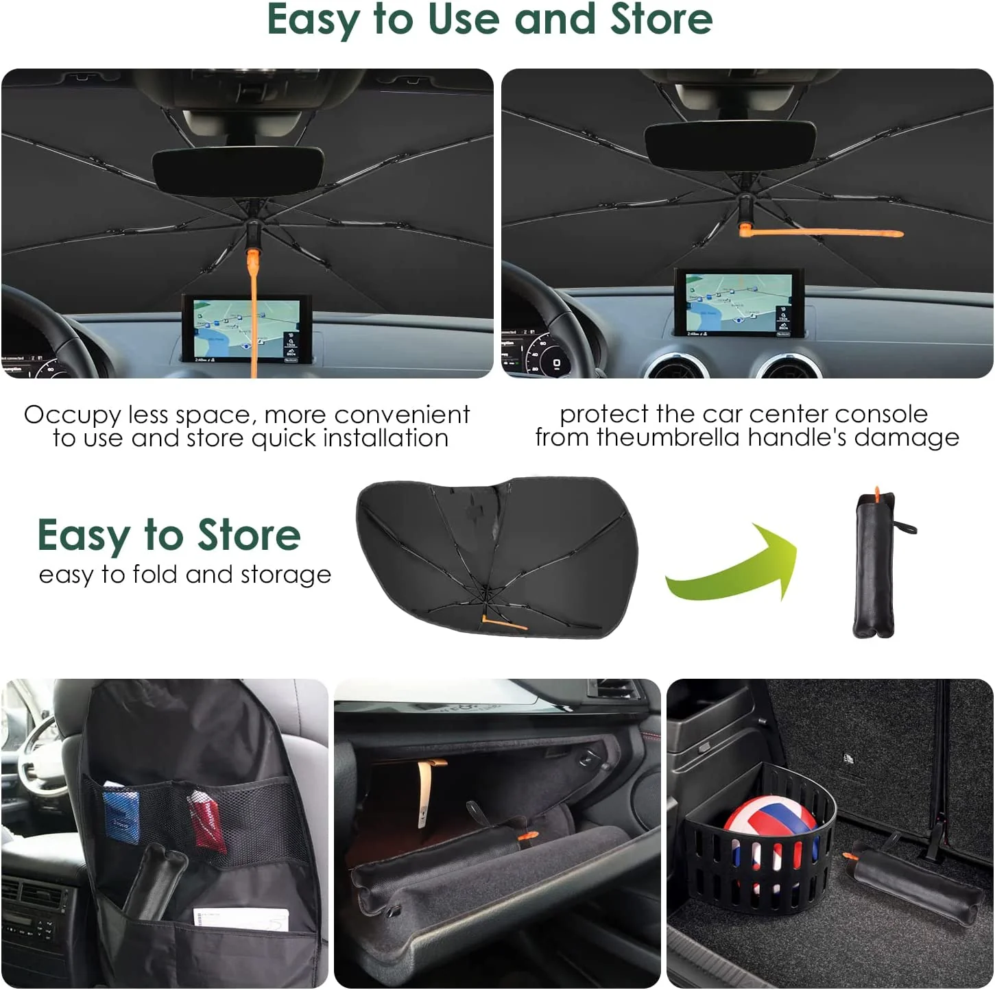 • Eenvoudig op te vouwen en op te bergen: de parasol voor de voorruit in paraplustijl werkt net als je normale paraplu en kan binnen enkele seconden zeer eenvoudig worden geopend en ingeklapt. De autozonwering is zeer praktisch voor dagelijks gebruik en het opvouwbare ontwerp maakt het eenvoudig op te bergen en neemt geen ruimte in de auto in