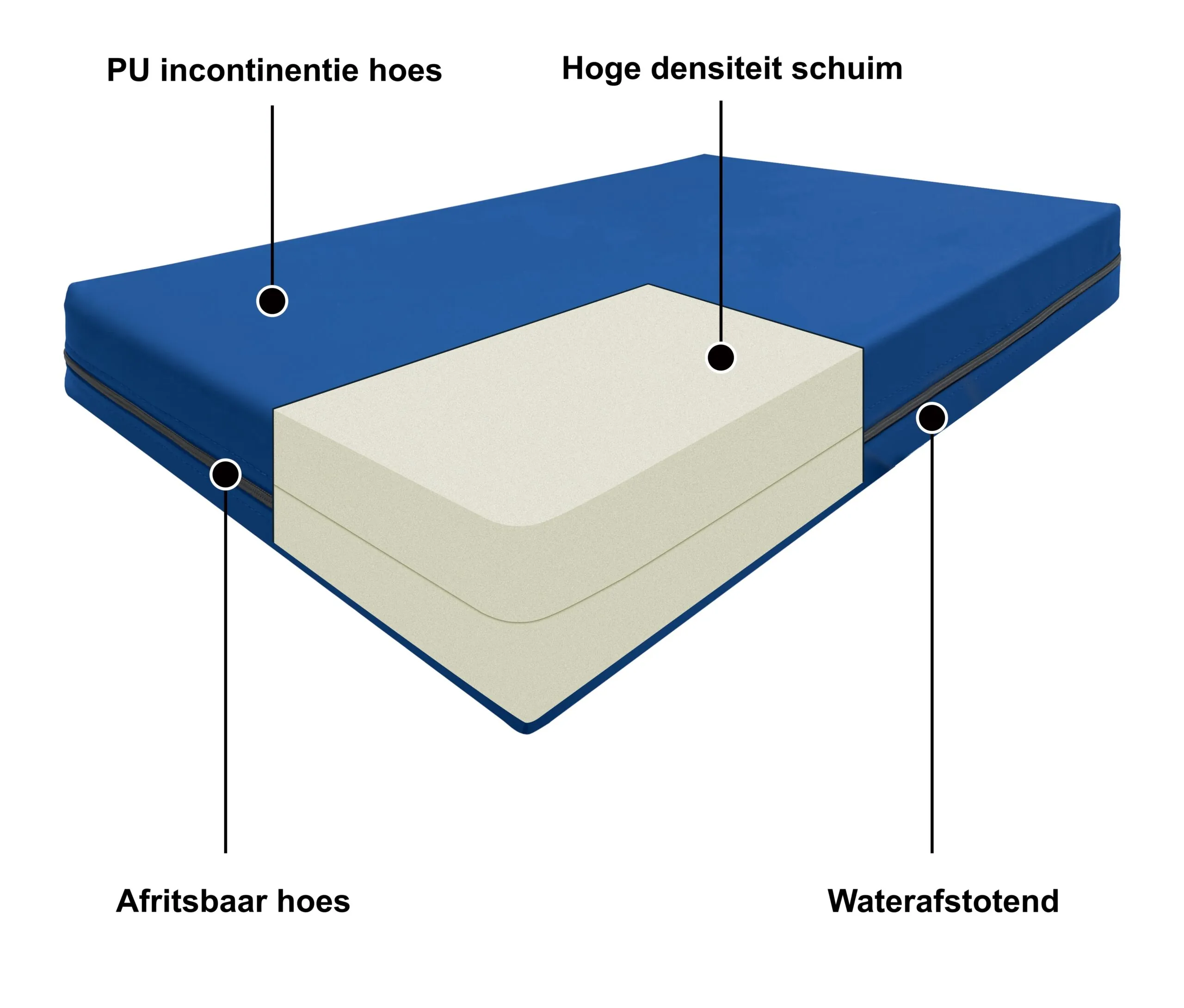 De ideale zorghotel matras waarbij de hoes afritsbaar is, waterafstotend is en ventilerend is. De rits is 3 zijdig. Een incontinentie hoes helpt om je matras fris en schoon te houden. De zorghotel matras matrashoes is vervaardigd uit rubberachtig Polyurethaan. Het grootste voordeel hiervan is dat het een ademende en ventilerende werking heeft, maar geen vocht doorlaat. Het andere voordeel is dat het wasbaar is op 60 graden.